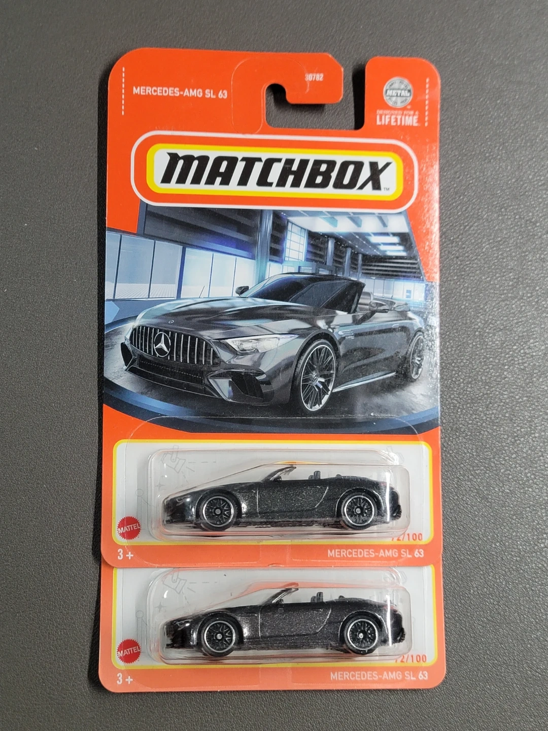 Two Matchbox die-cast cars featuring the Mercedes-AMG SL 63. Each car is detailed and designed for play. Recommended for ages 3 and up.