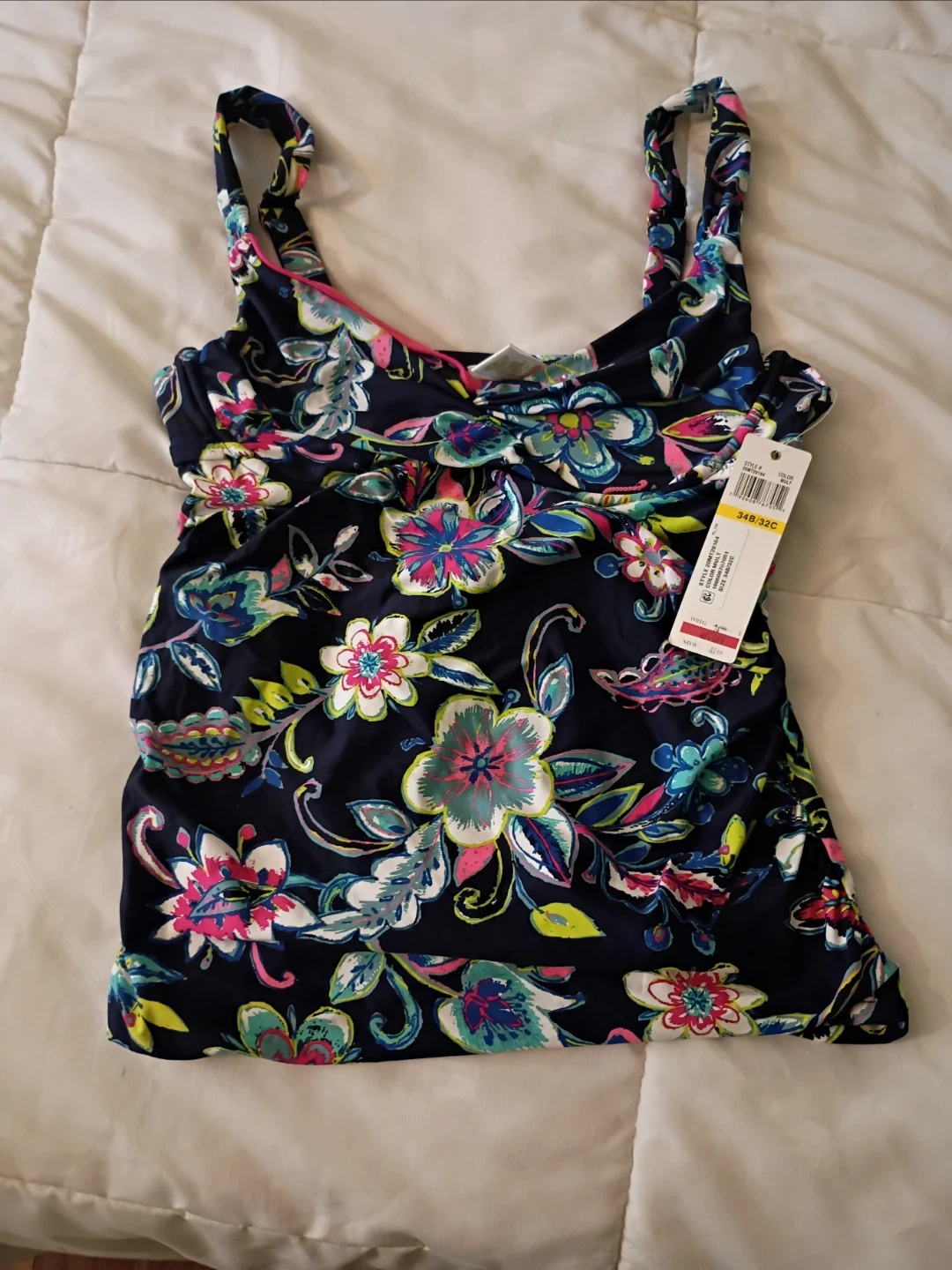 Navy blue tankini top with a vibrant floral print. It features adjustable straps and ruched detailing. Made with a blend of polyester and spandex for comfort and fit.