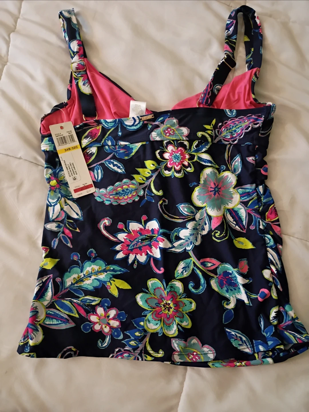 Navy blue tankini top with a vibrant floral print. It features adjustable straps and ruched detailing. Made with a blend of polyester and spandex for comfort and fit.