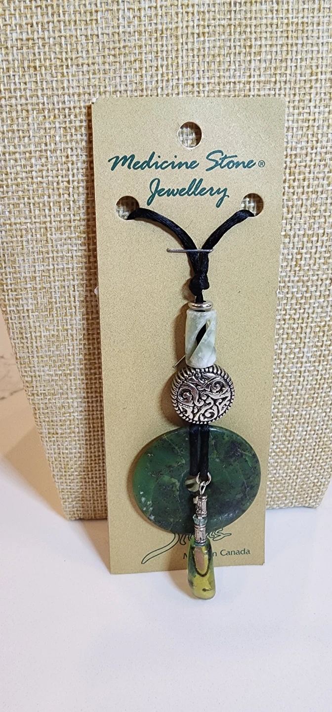 This is a Medicine Stone Jewellery necklace. It features a dark green stone pendant and decorative silver accents. A unique piece to add to your collection!