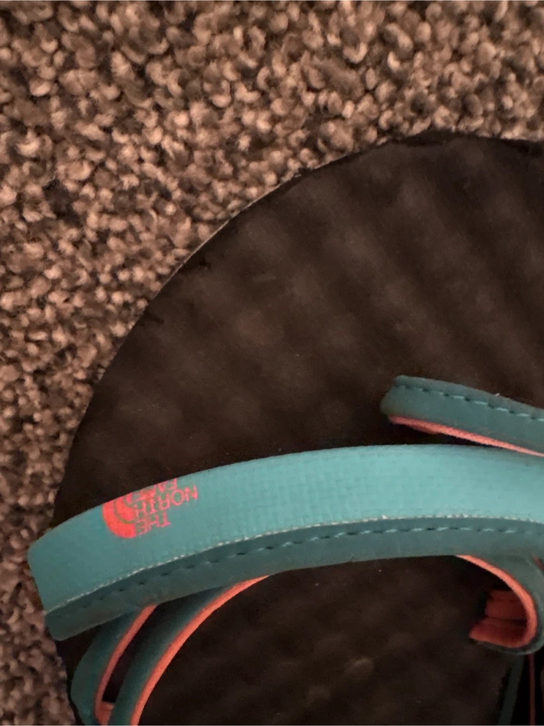 The North Face flip flops in black with teal and coral straps. Comfortable and casual for everyday wear. Perfect for the beach or poolside! Womens size 8, like new condition.