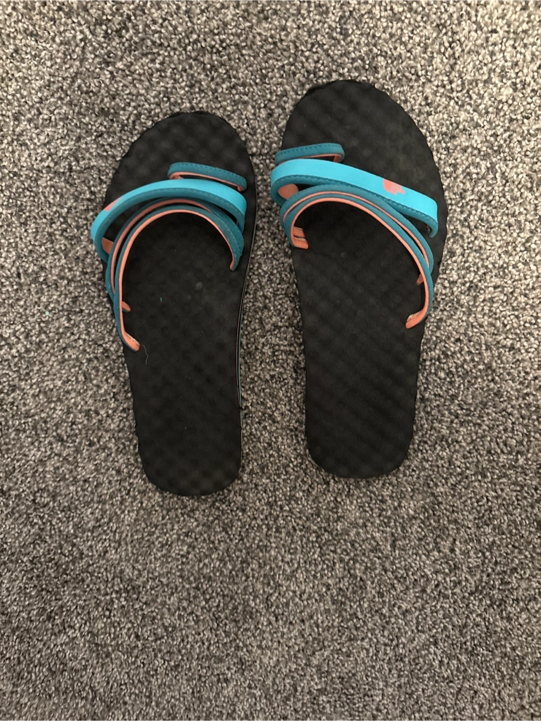 The North Face flip flops in black with teal and coral straps. Comfortable and casual for everyday wear. Perfect for the beach or poolside! Womens size 8, like new condition.