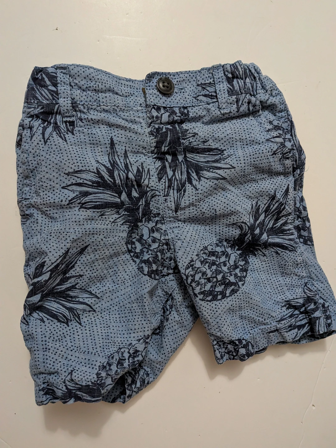 These light blue shorts feature a fun navy pineapple print. They have an elastic waistband with a button closure and belt loops. Made from a comfortable fabric.