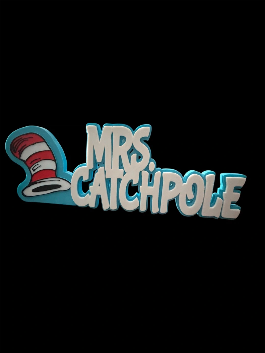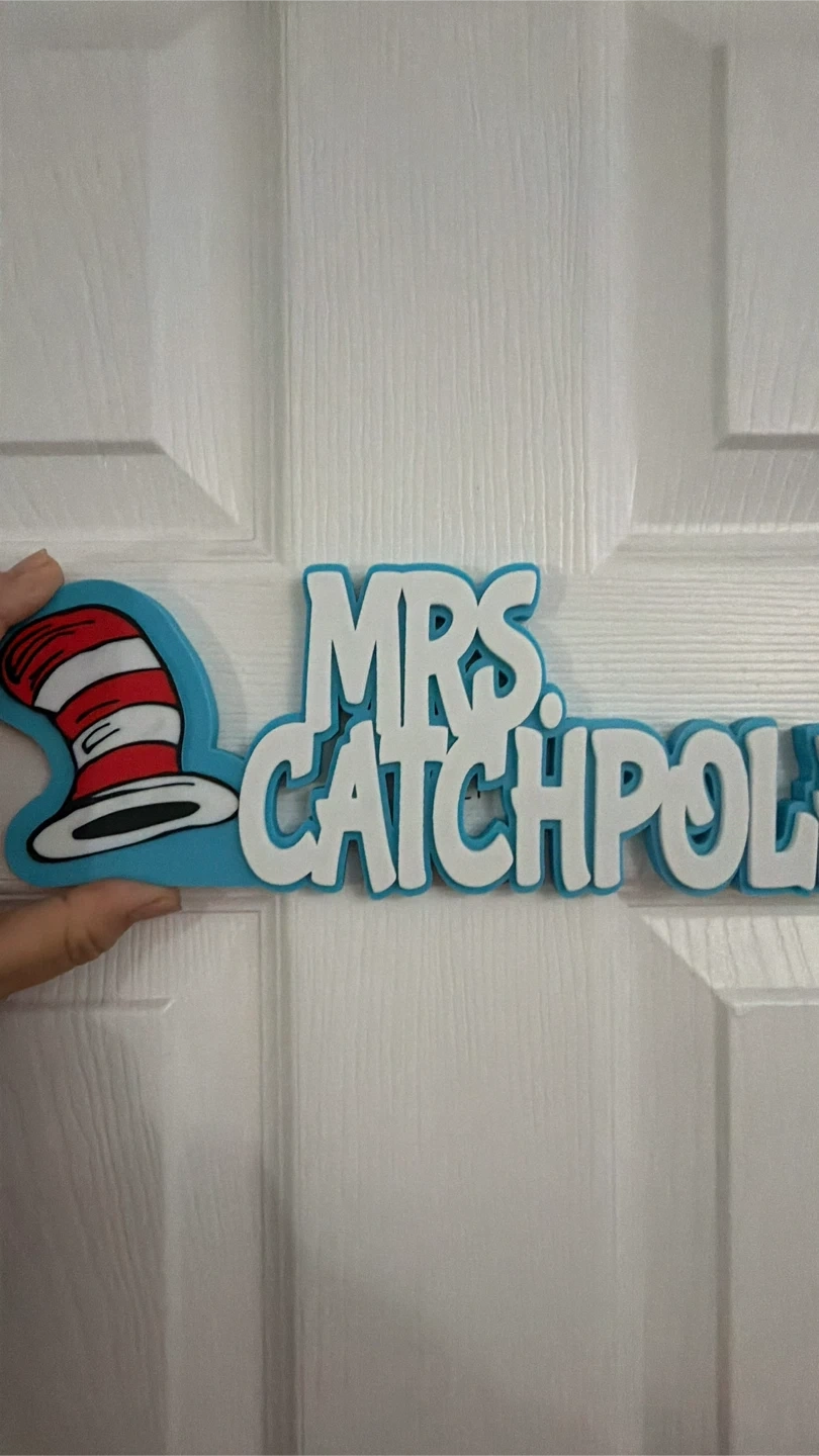 This is a fun, personalized door sign featuring the iconic Cat in the Hat. It proudly displays 'MRS. CATCHPOLE' in bold, dimensional lettering. It's a great way to personalize a classroom door or child's room!