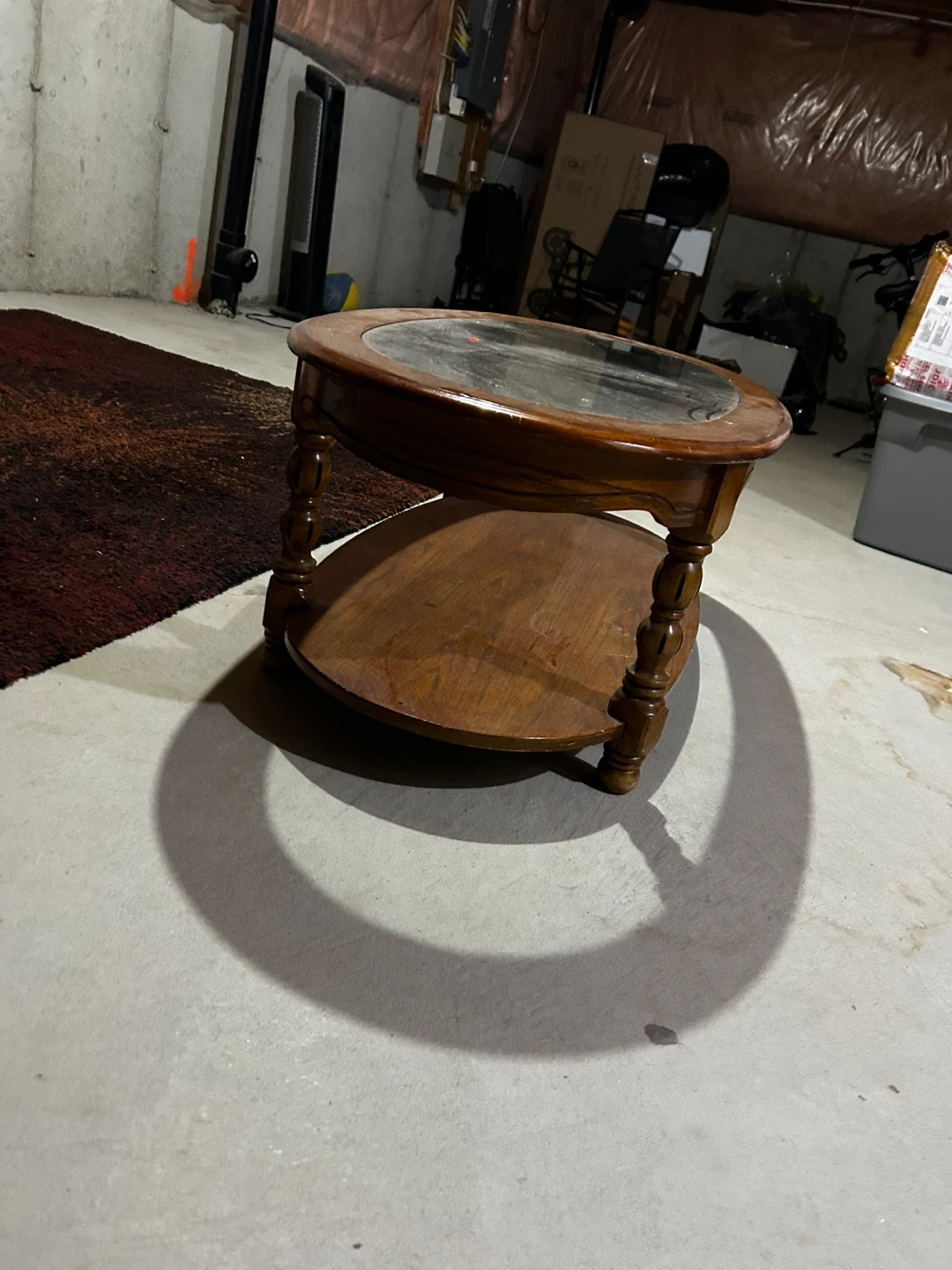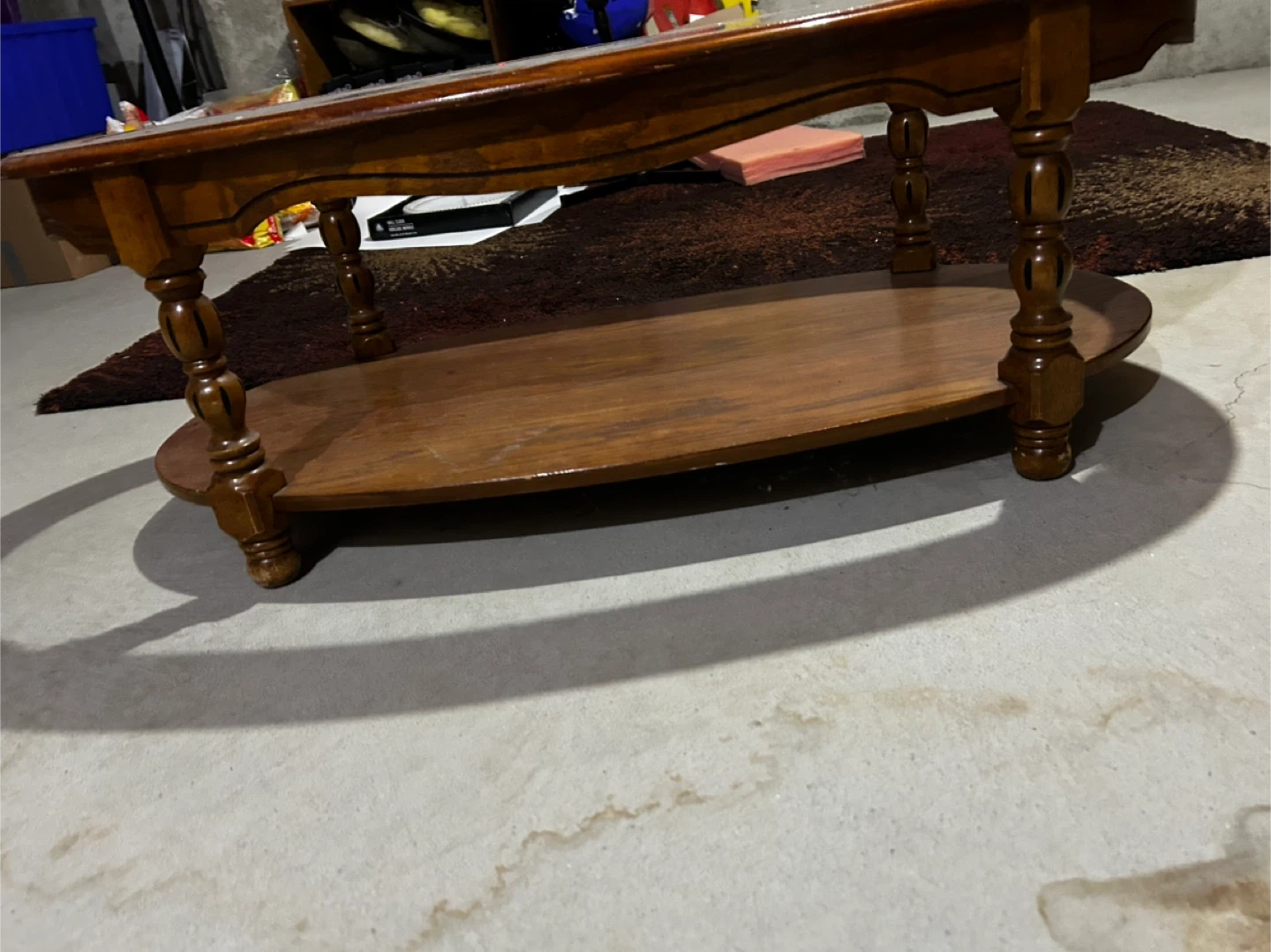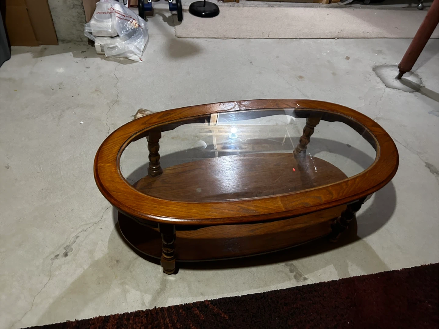 This oval coffee table features a glass top and a solid wood base with a lower shelf. It has a rich wood finish and carved detailing on the legs. Great for adding a classic touch to your living space!