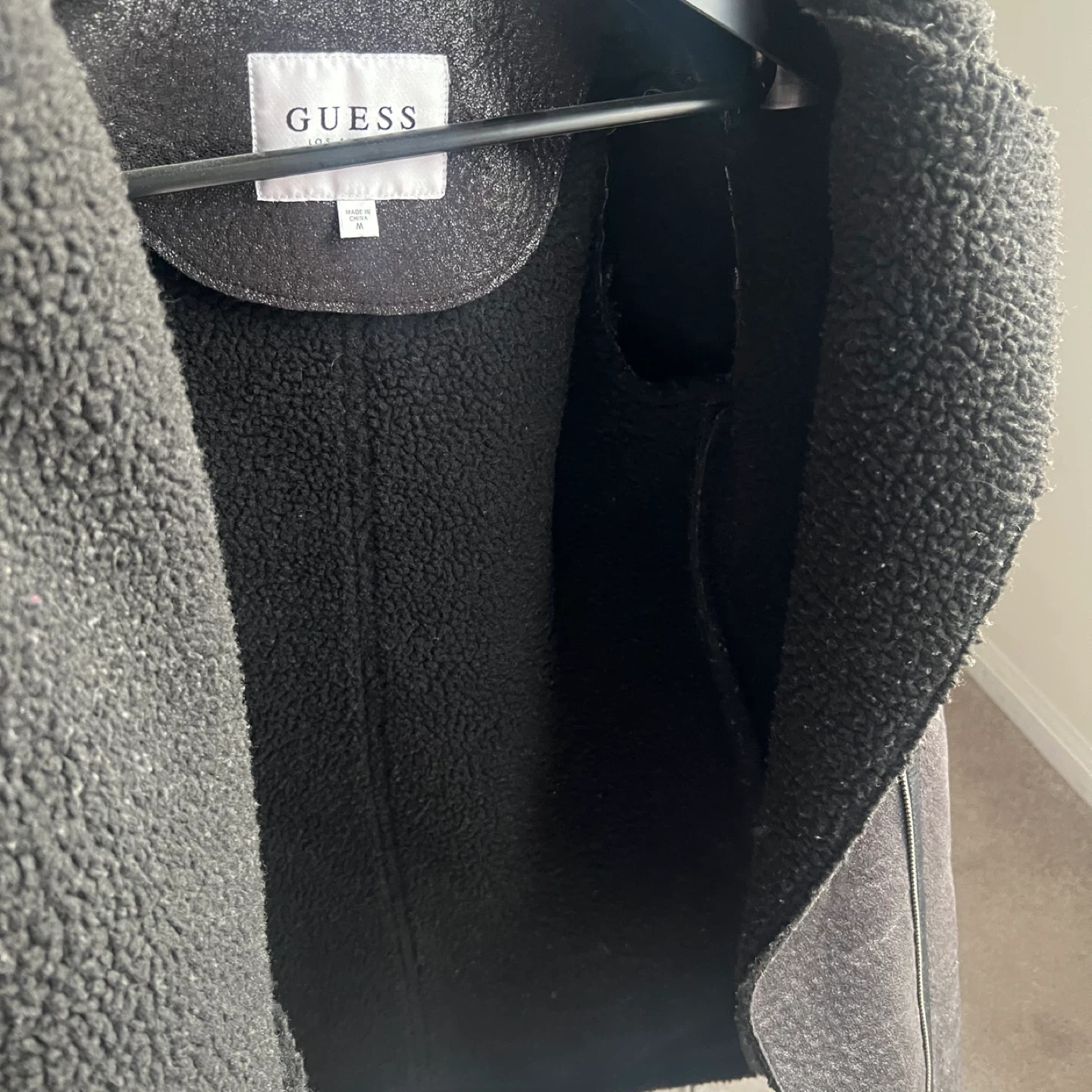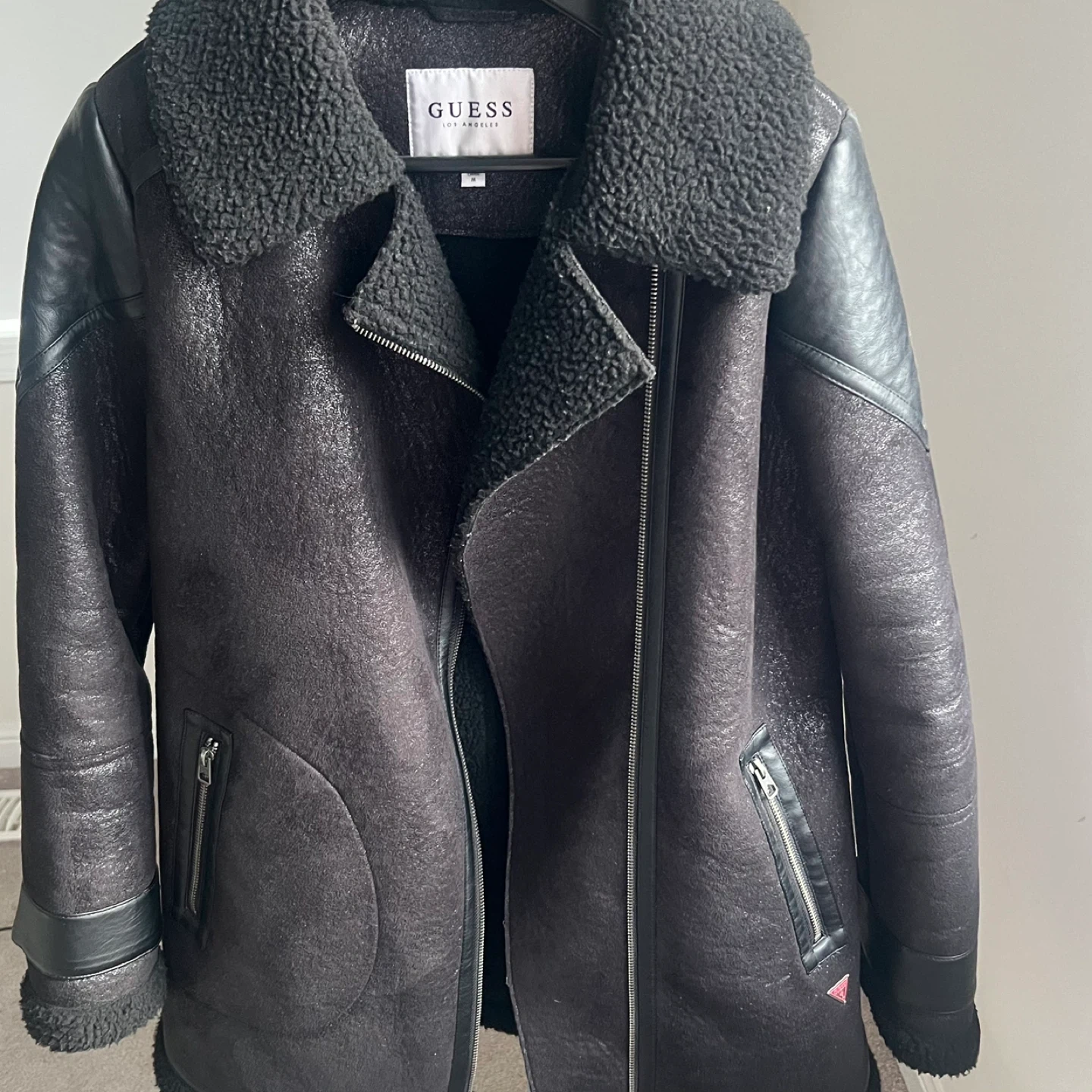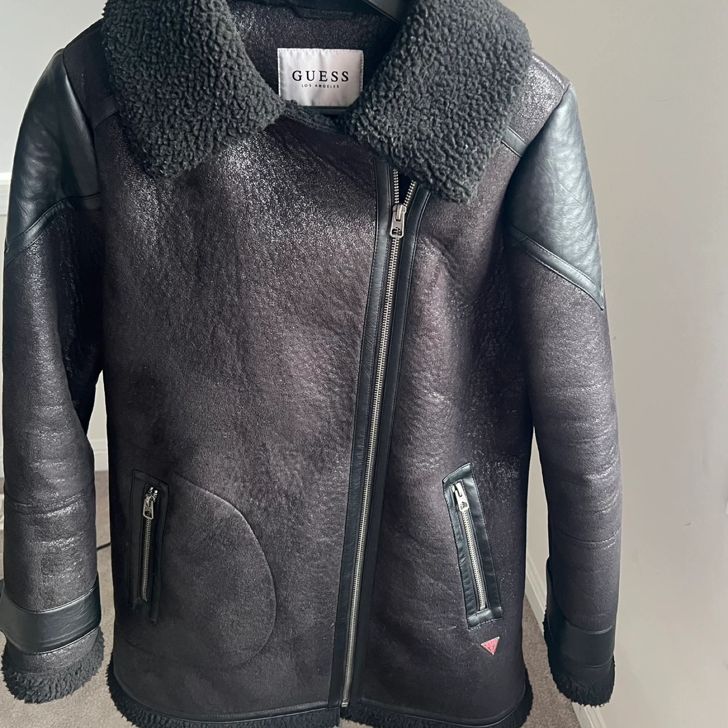 Guess black faux shearling lined biker jacket. Features faux leather paneling and zip pockets. Cozy Sherpa lining for warmth.