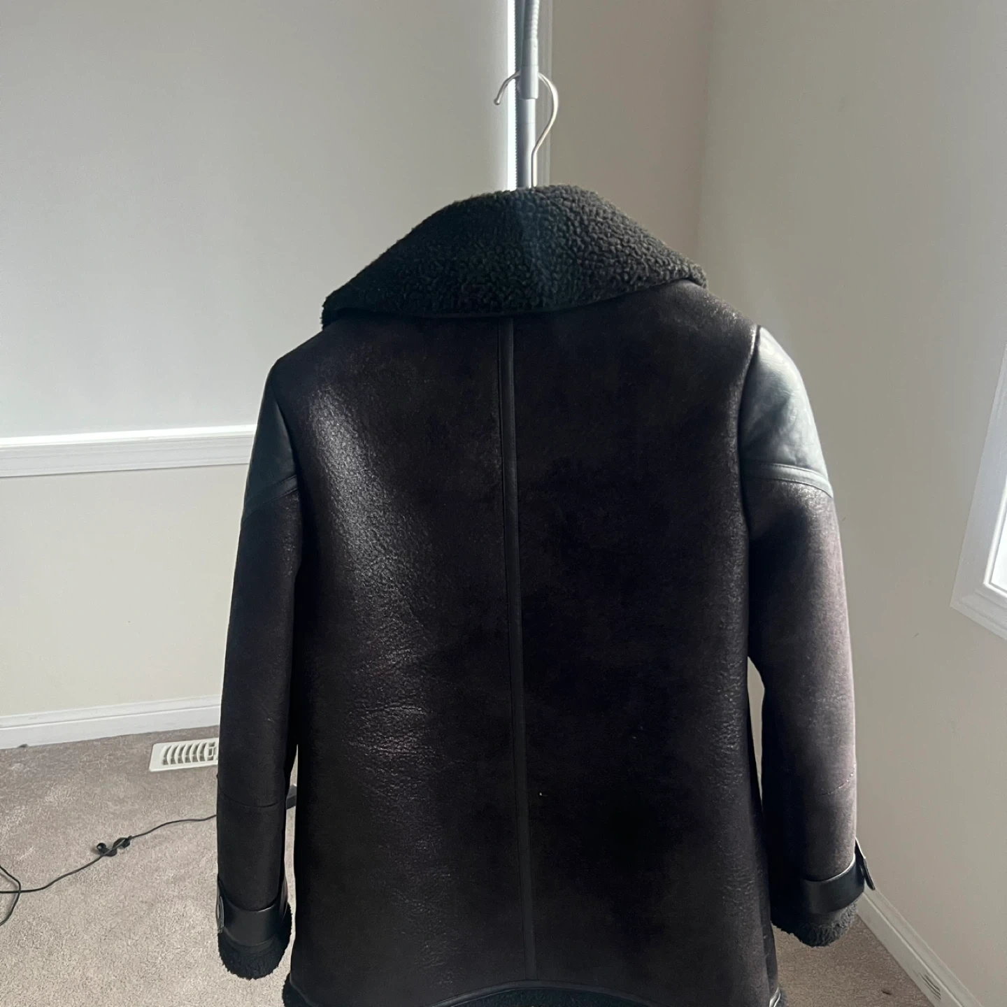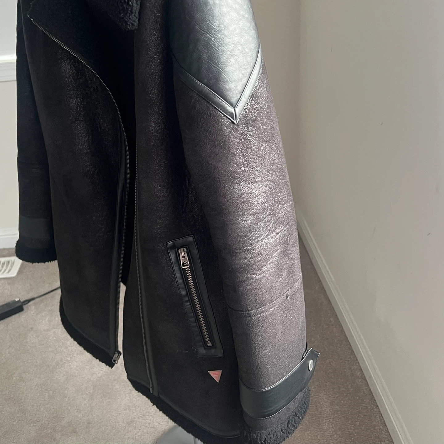 Guess black faux shearling lined biker jacket. Features faux leather paneling and zip pockets. Cozy Sherpa lining for warmth.