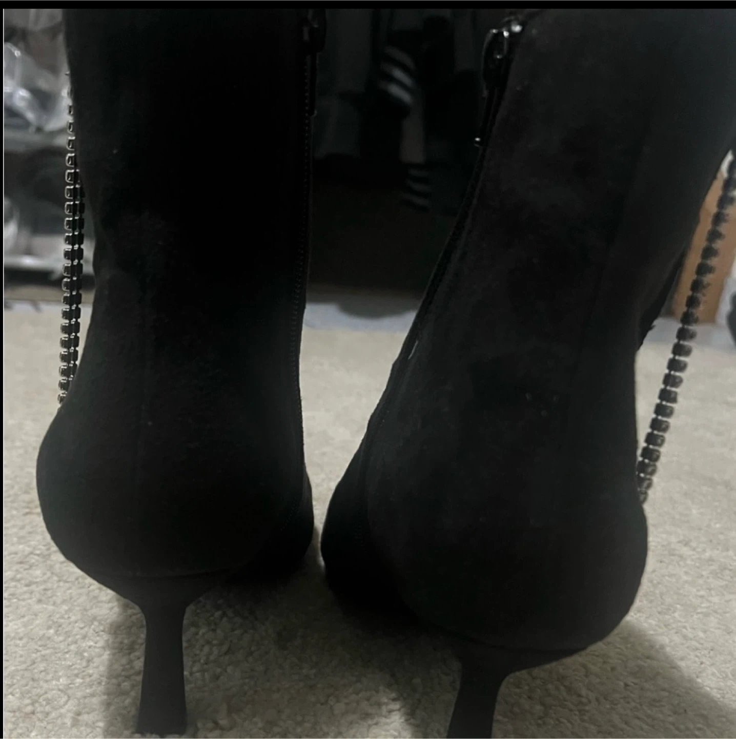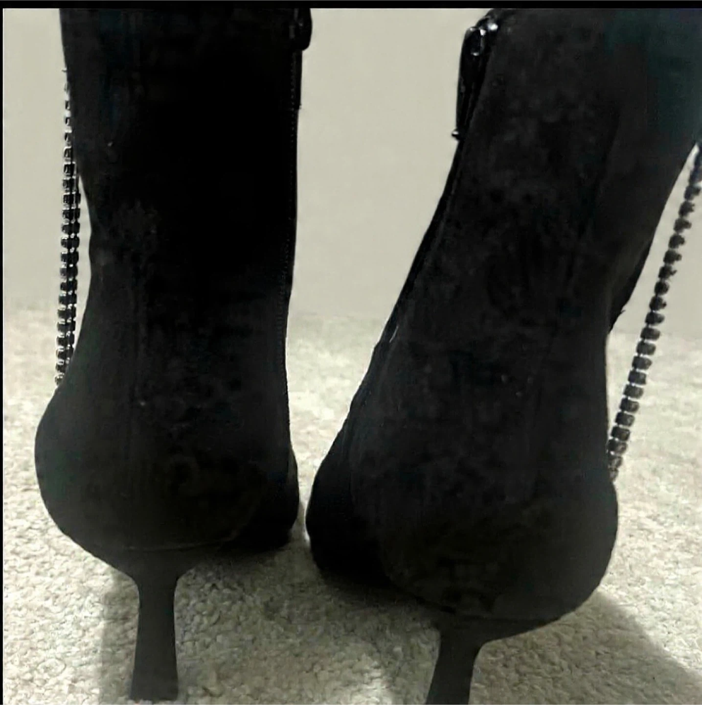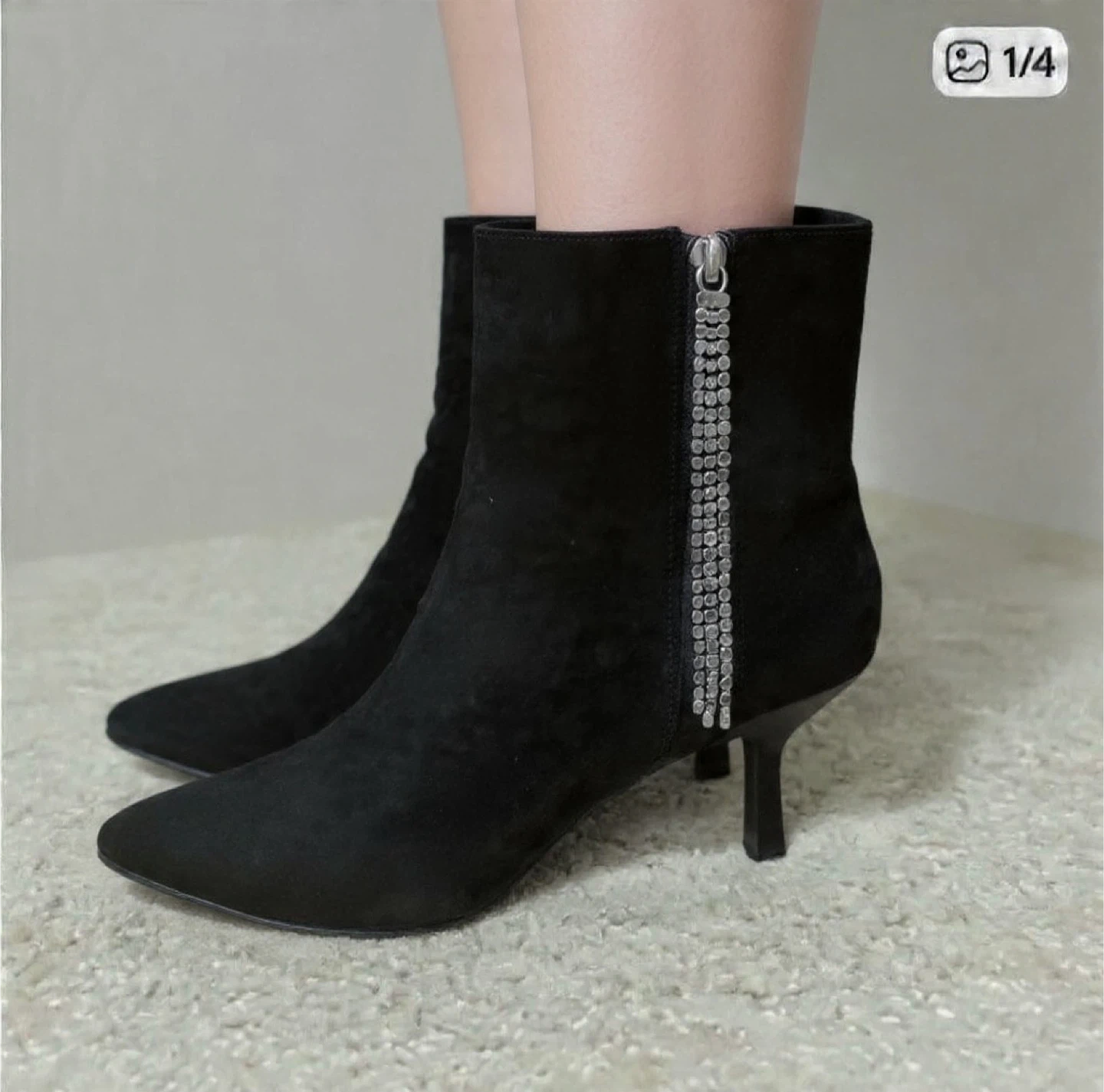 These black ankle boots are made from suede material. They feature a side zipper with rhinestone detailing. The heel is a stylish kitten heel.