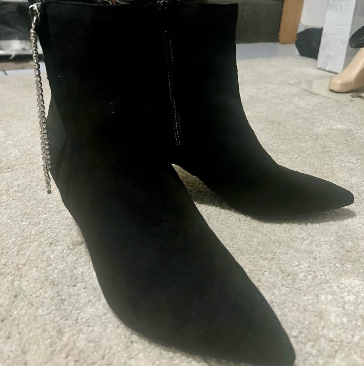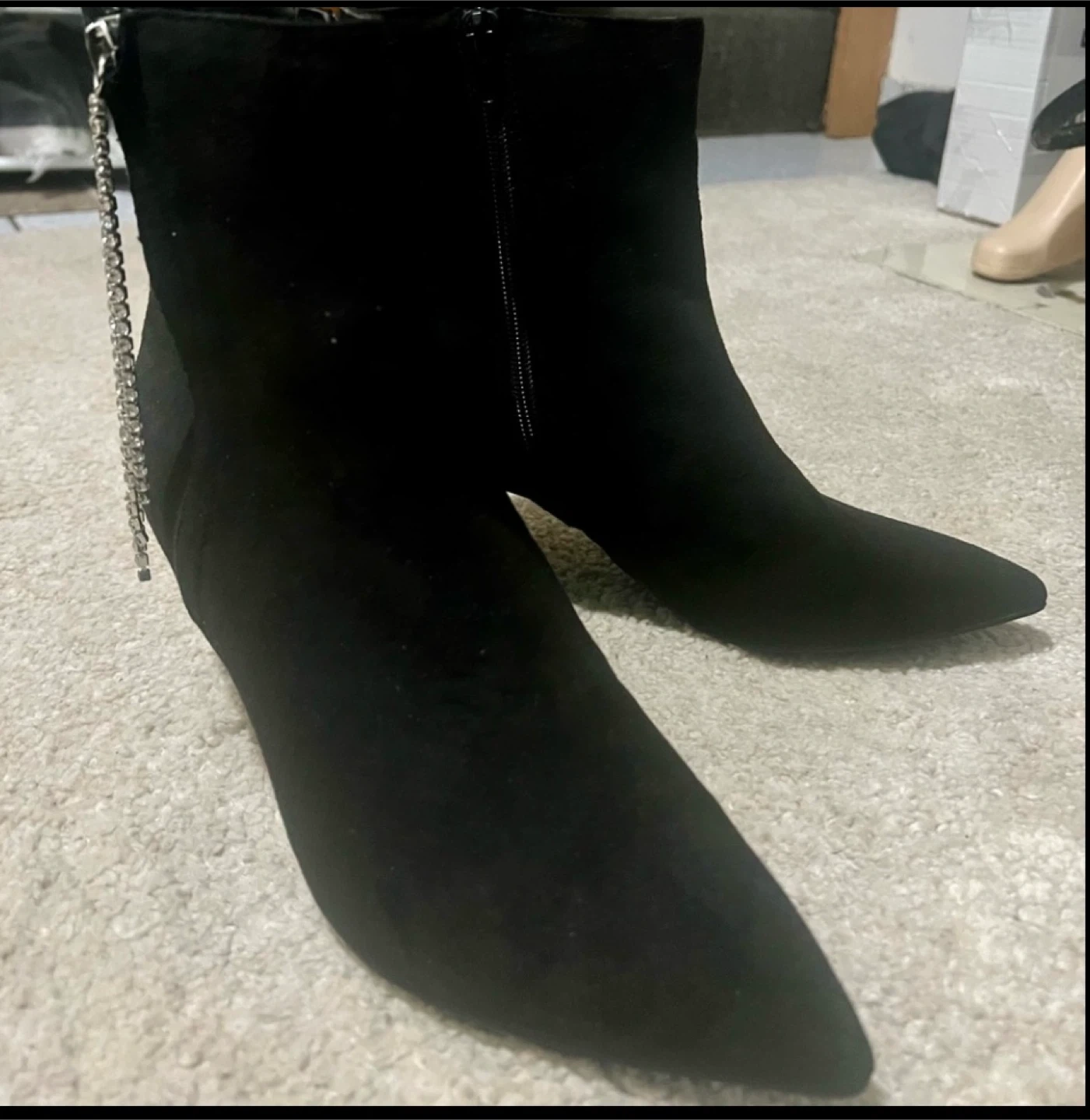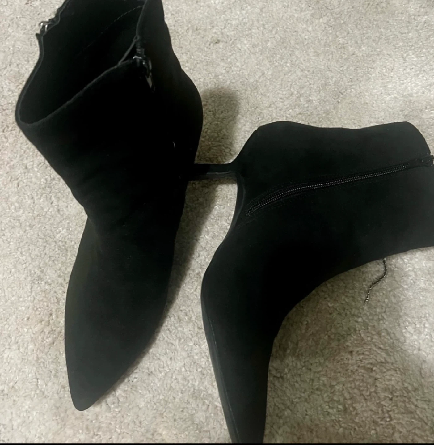 These black ankle boots are made from suede material. They feature a side zipper with rhinestone detailing. The heel is a stylish kitten heel.