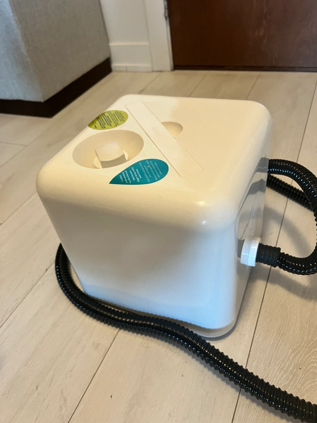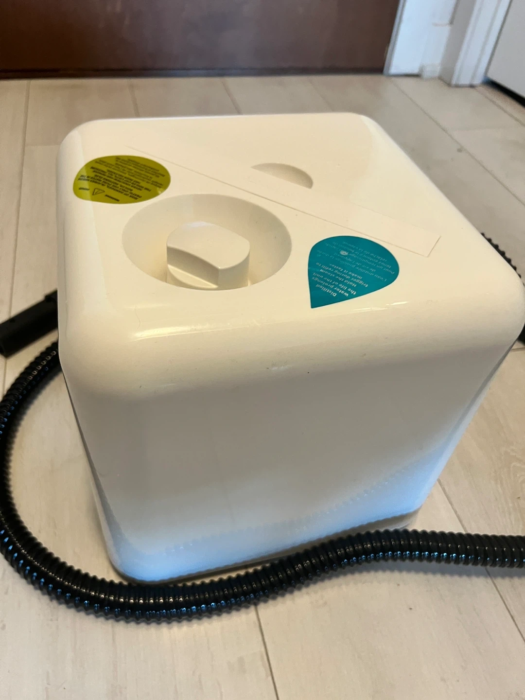 A white steam cleaner unit with a flexible hose attachment. It's designed for cleaning tasks. This unit would be useful for tackling tough grime and sanitizing surfaces.