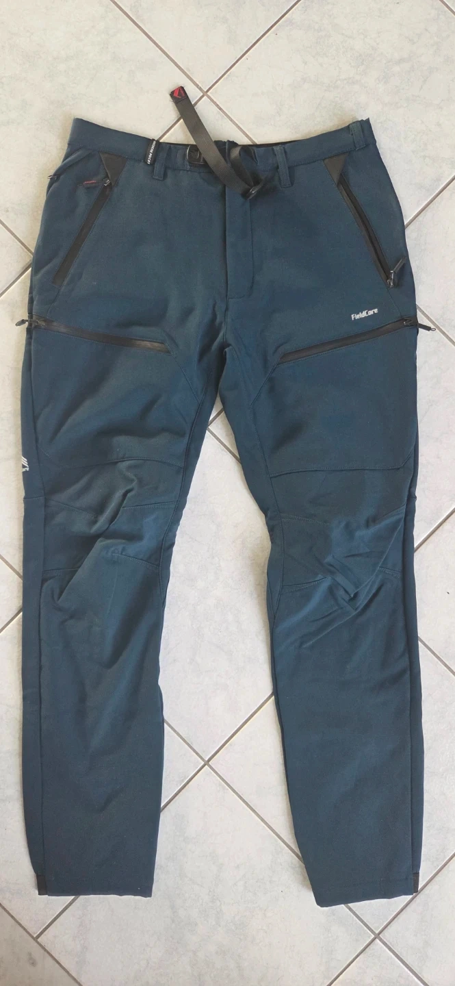 FieldCore hiking pants in a deep teal colour. Made from polyester and polyurethane blend for durability and comfort. These pants feature a zip-fly closure and belt loops, along with multiple zippered pockets for secure storage.