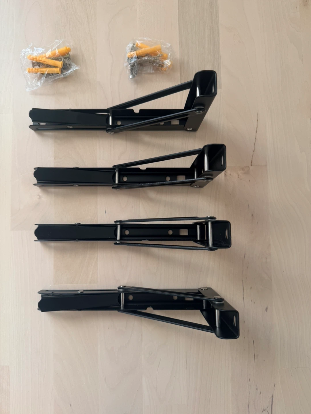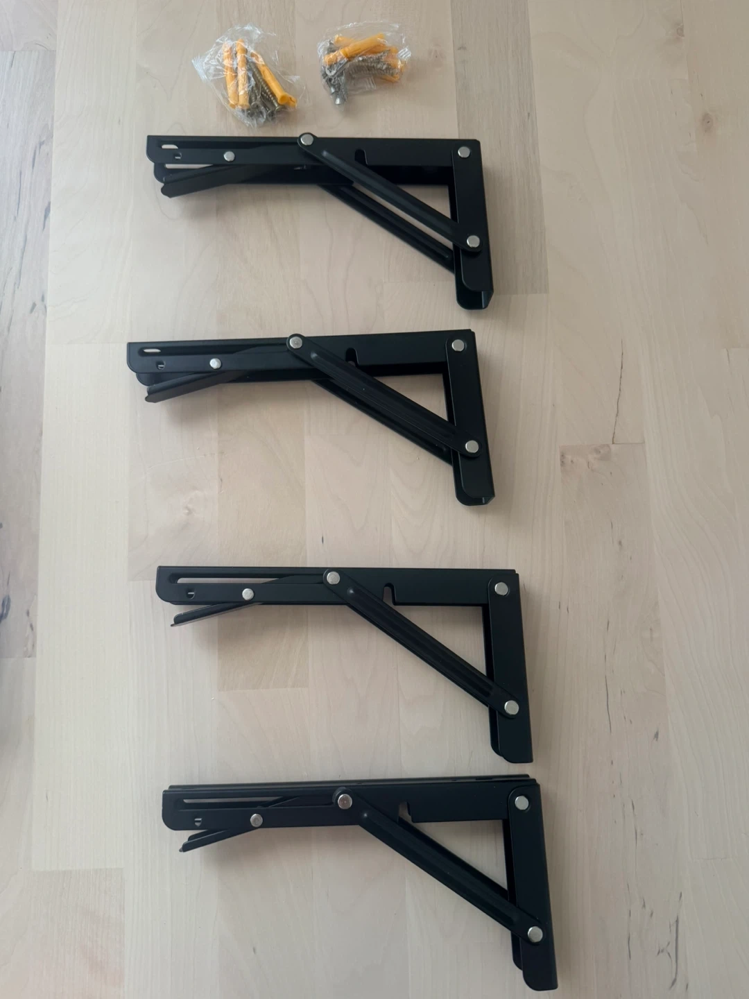 Set of four black folding shelf brackets. Includes wall anchors and screws for installation. Brackets fold flat when not in use. Metal construction.