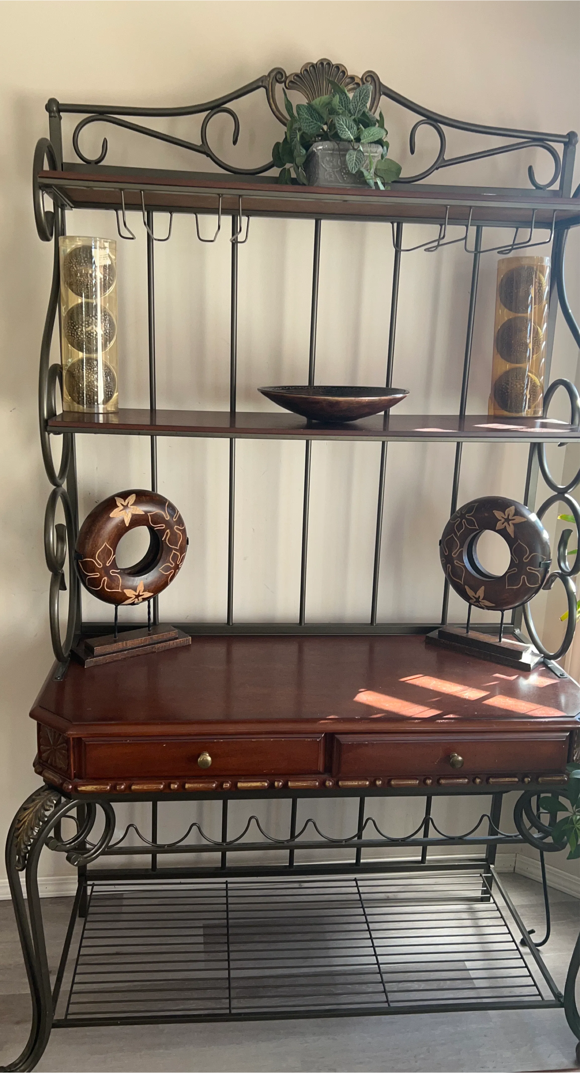 This wall unit features a wood finish with a metal frame. It includes a top shelf with wine glass holders and a lower section has two drawers and a wire rack shelf.