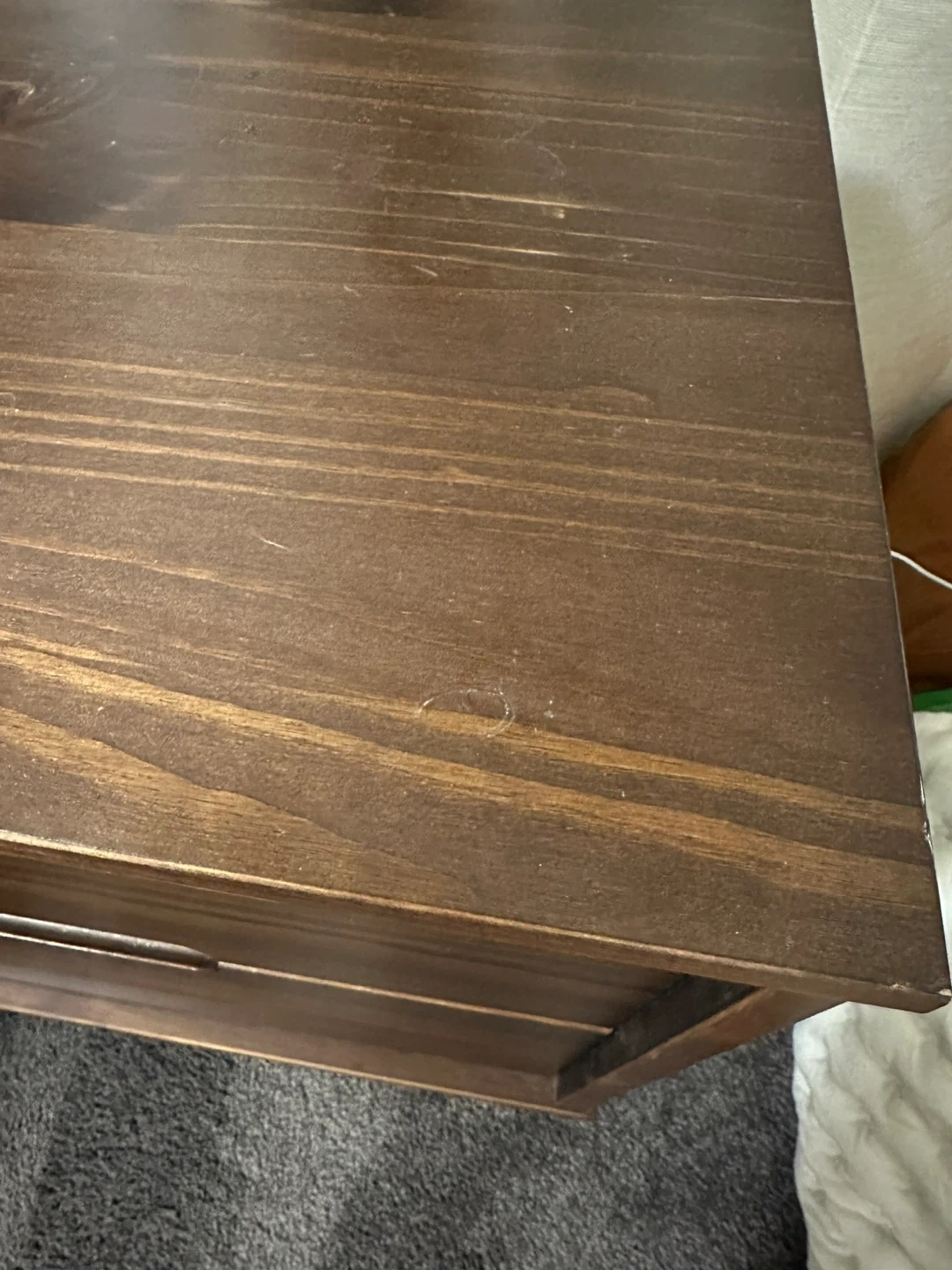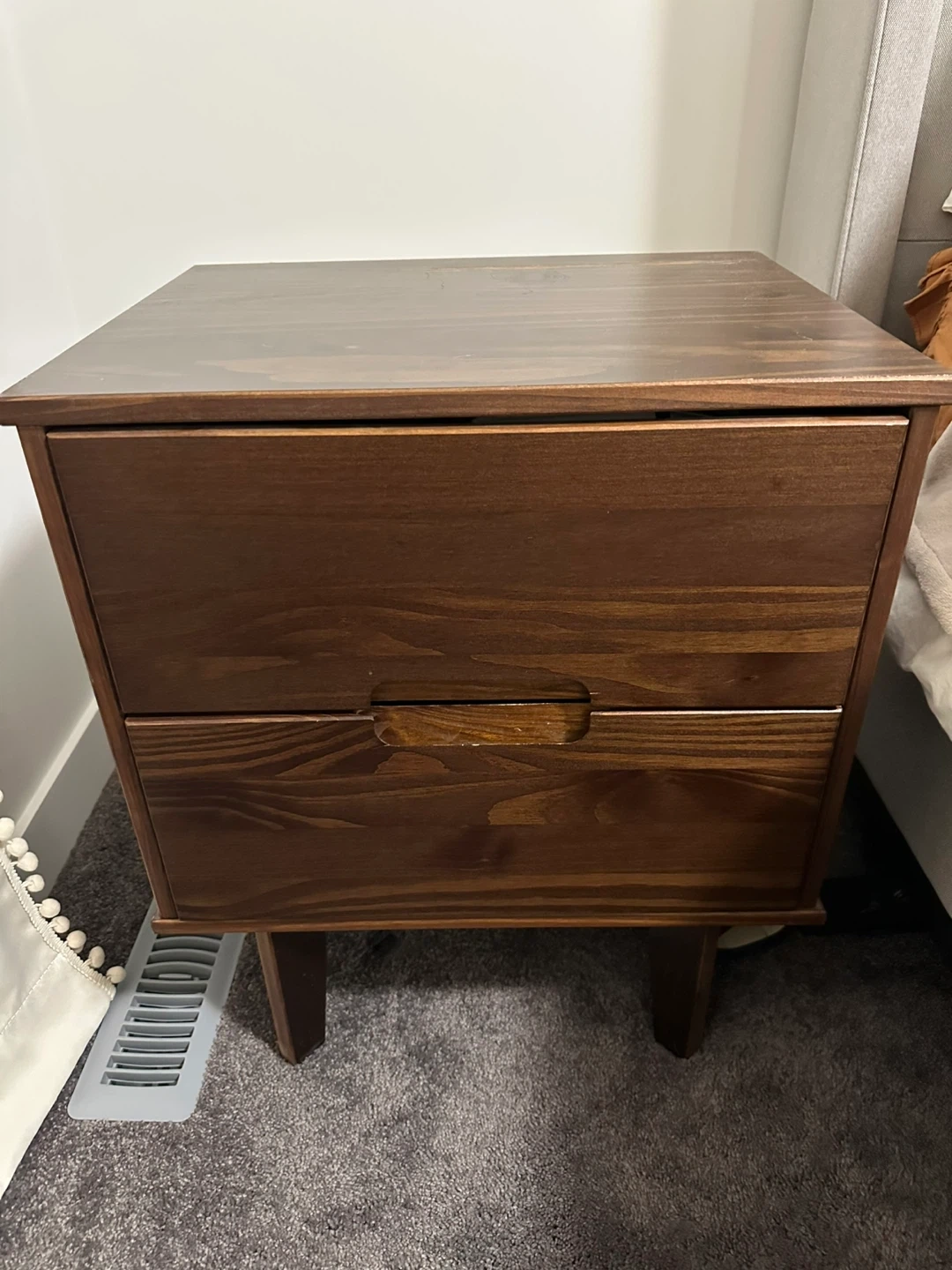 Mid century modern nightstands (2) is made of dark stained wood. It has two drawers for storage.