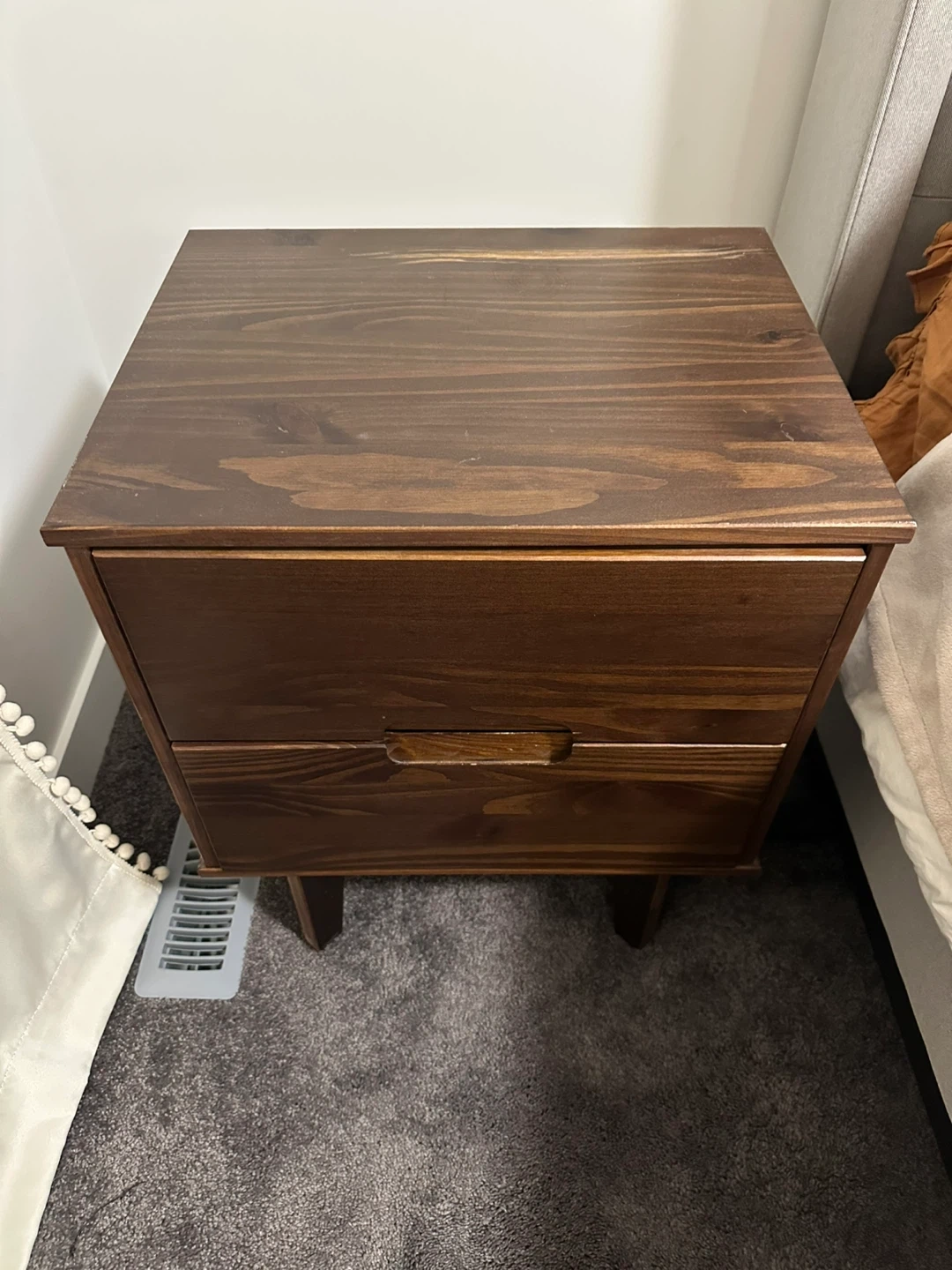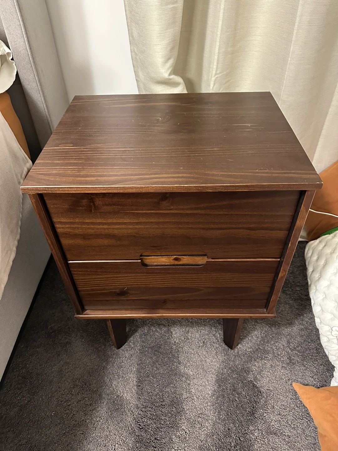 Mid century modern nightstands (2) is made of dark stained wood. It has two drawers for storage.