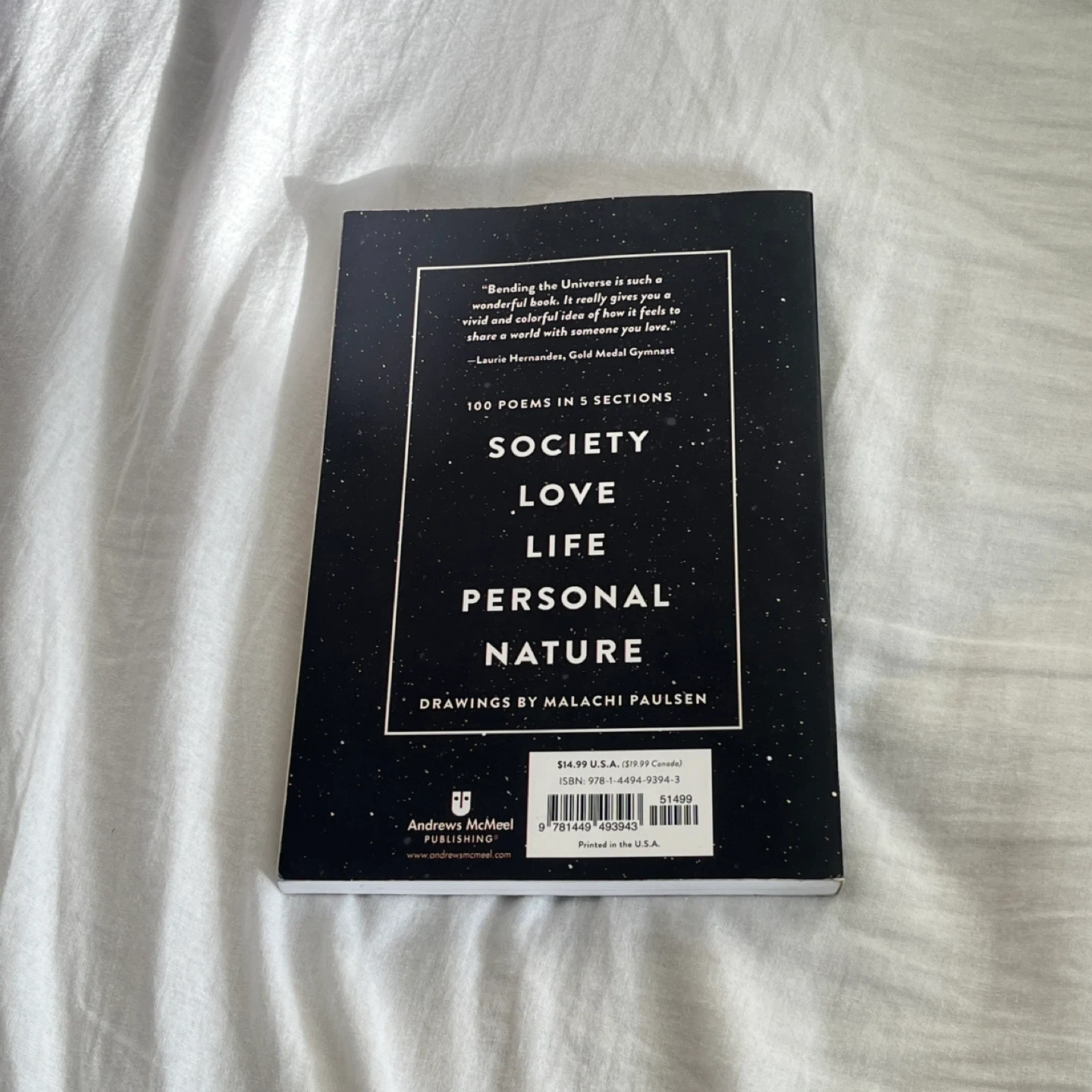 Selling a copy of "Bending the Universe" by Justin Wetch! It's an original poetry collection that's divided into 5 sections: Society, Love, Life, Personal, and Nature. It also features drawings by Malachi Paulsen. A wonderful book!