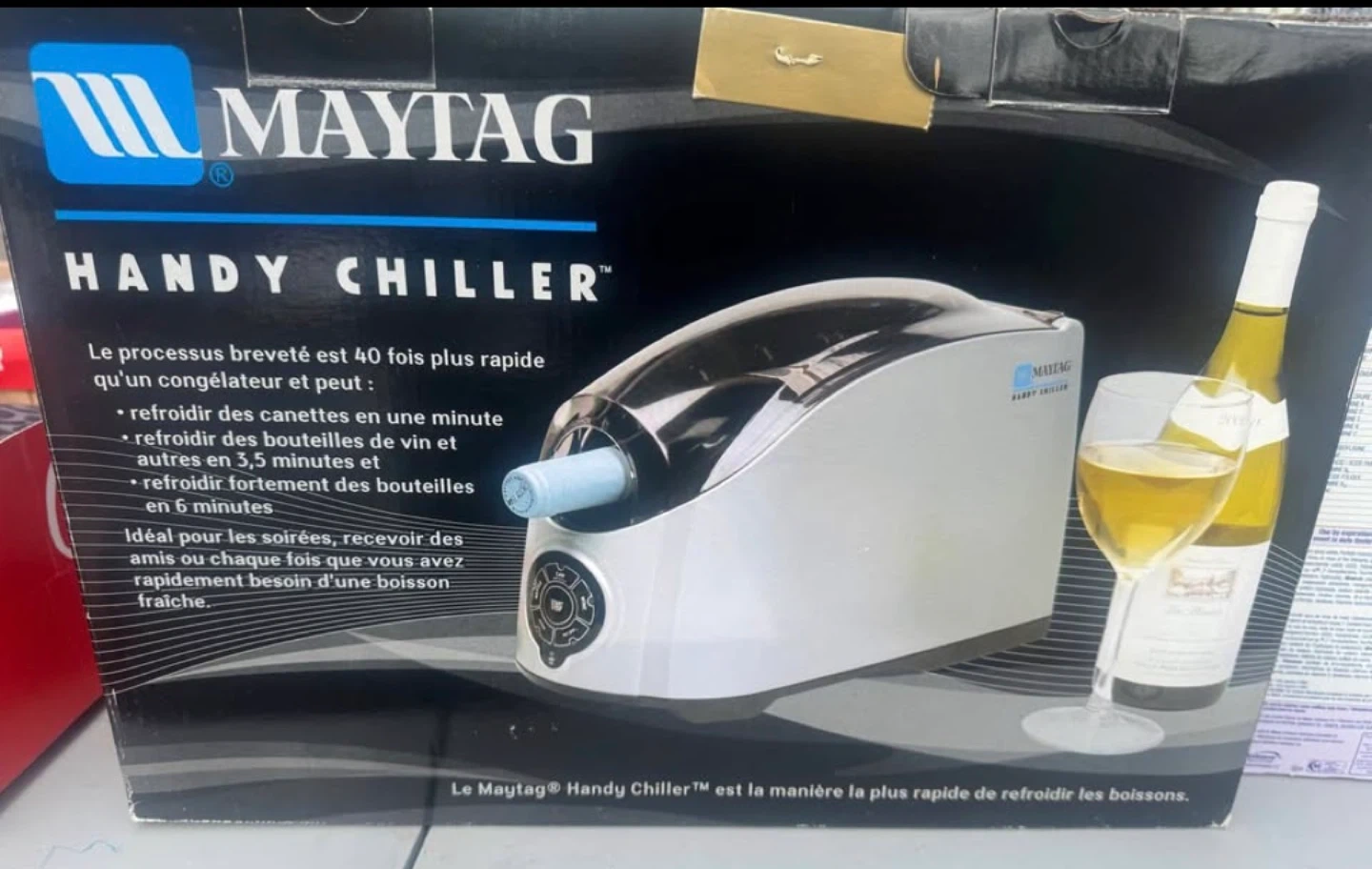 Maytag Handy Chiller cools cans in one minute, wine bottles in 3.5 minutes, and bottles in 6 minutes. It's ideal for parties or when you need a quick cold drink.