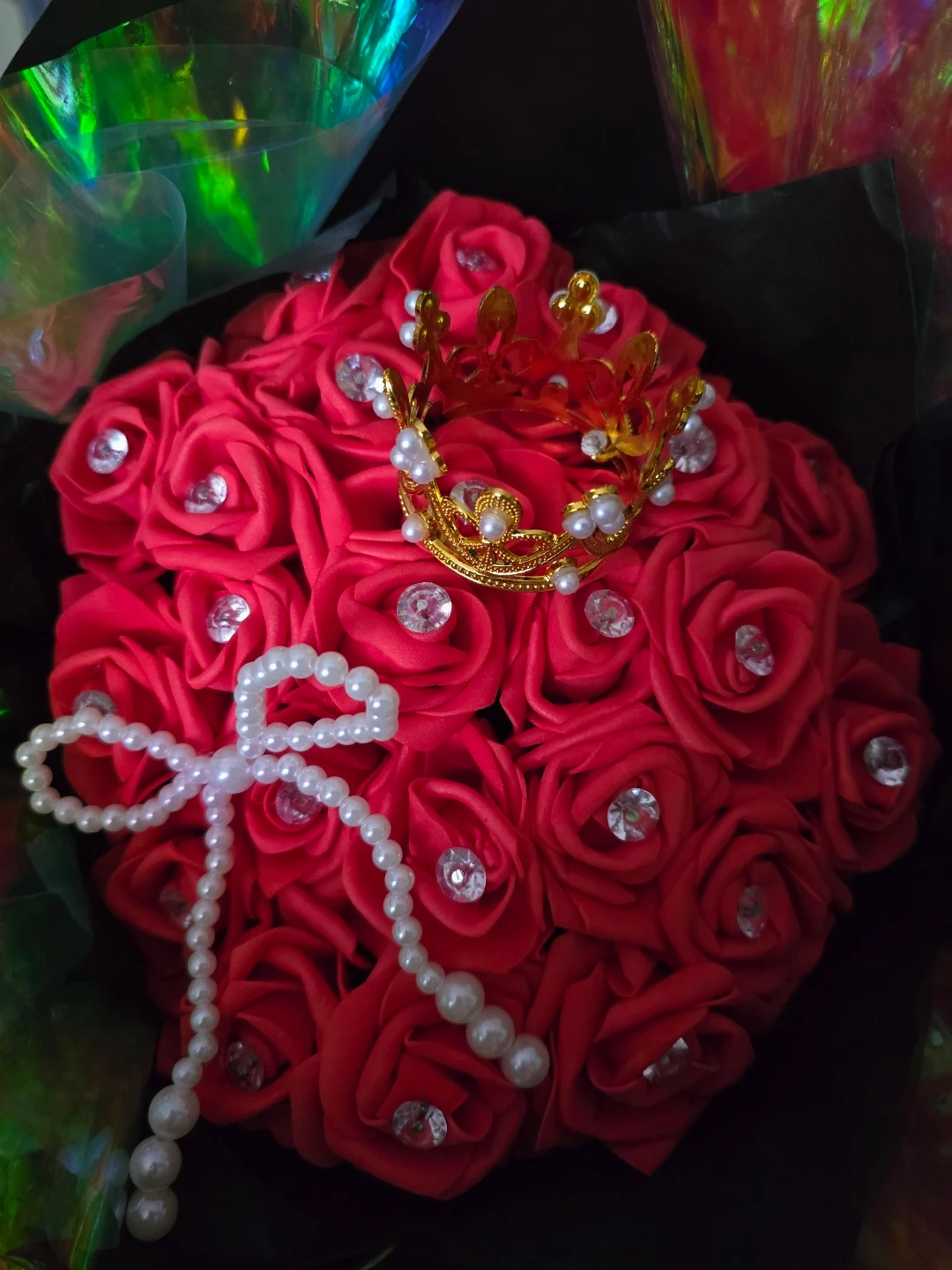 Red Artificial Rose Bouquet with Crown and Pearls
