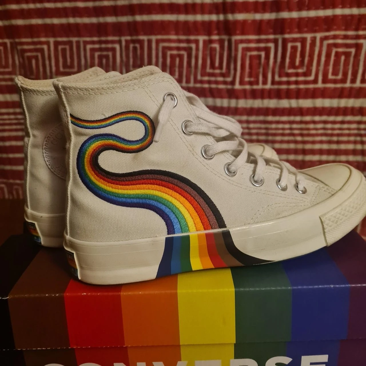 These Converse Chuck Taylor All Star high top sneakers feature a rainbow wave design. size 8.5 or a UK 6.5.