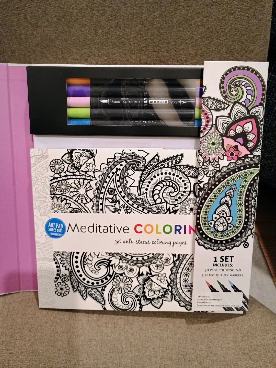 This set includes a 50-page anti-stress coloring pad. It also comes with 5 artist quality markers. It's great for unwinding and creative expression!