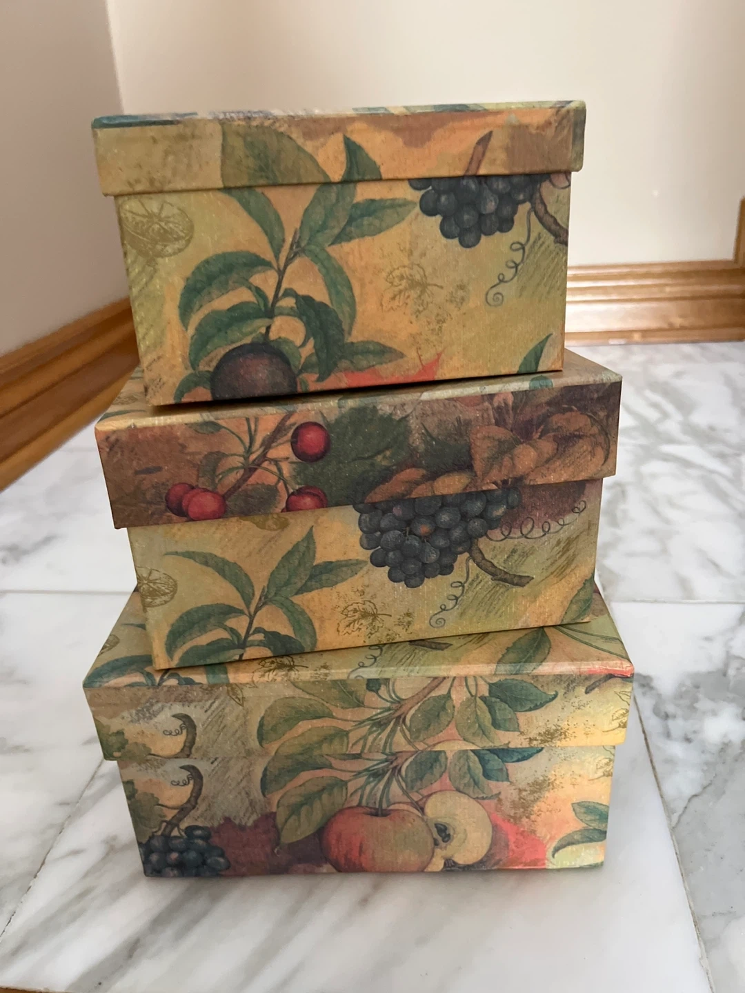 NEW set of three decorative storage boxes. They feature a harvest fruit and vine pattern. Boxes are great for organizing small items. Cash only $10 for set
