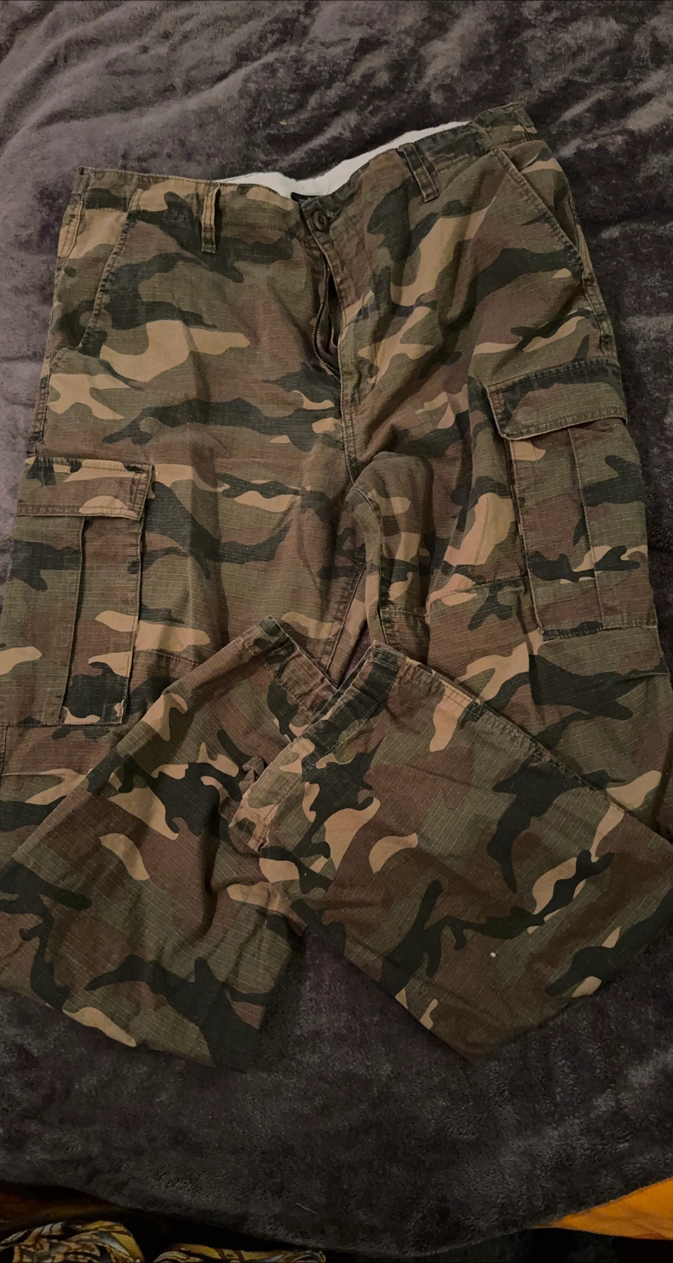 Cargo pants with a camouflage pattern. Featuring a zip closure. Multiple pockets visible. Relaxing in these pants at home could be a great way to spend your time.