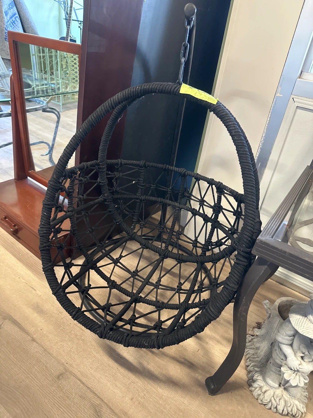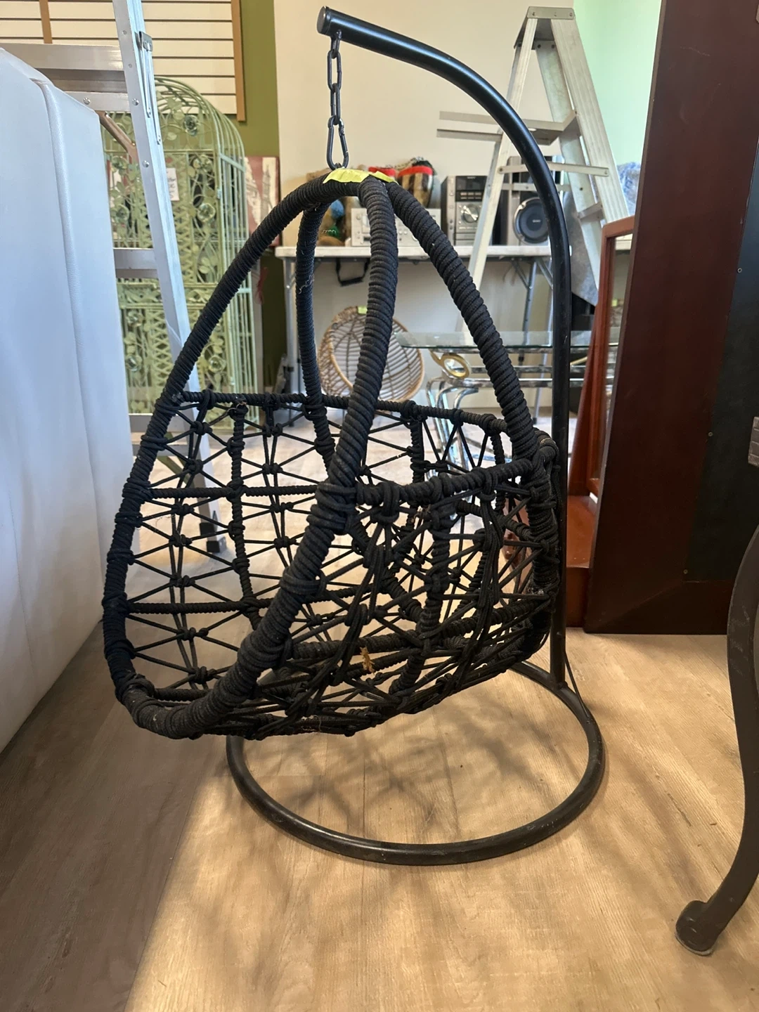 Selling a black hanging egg chair for pet! The chair features a sturdy metal frame and a comfortable woven seat. Perfect for cats and small dogs