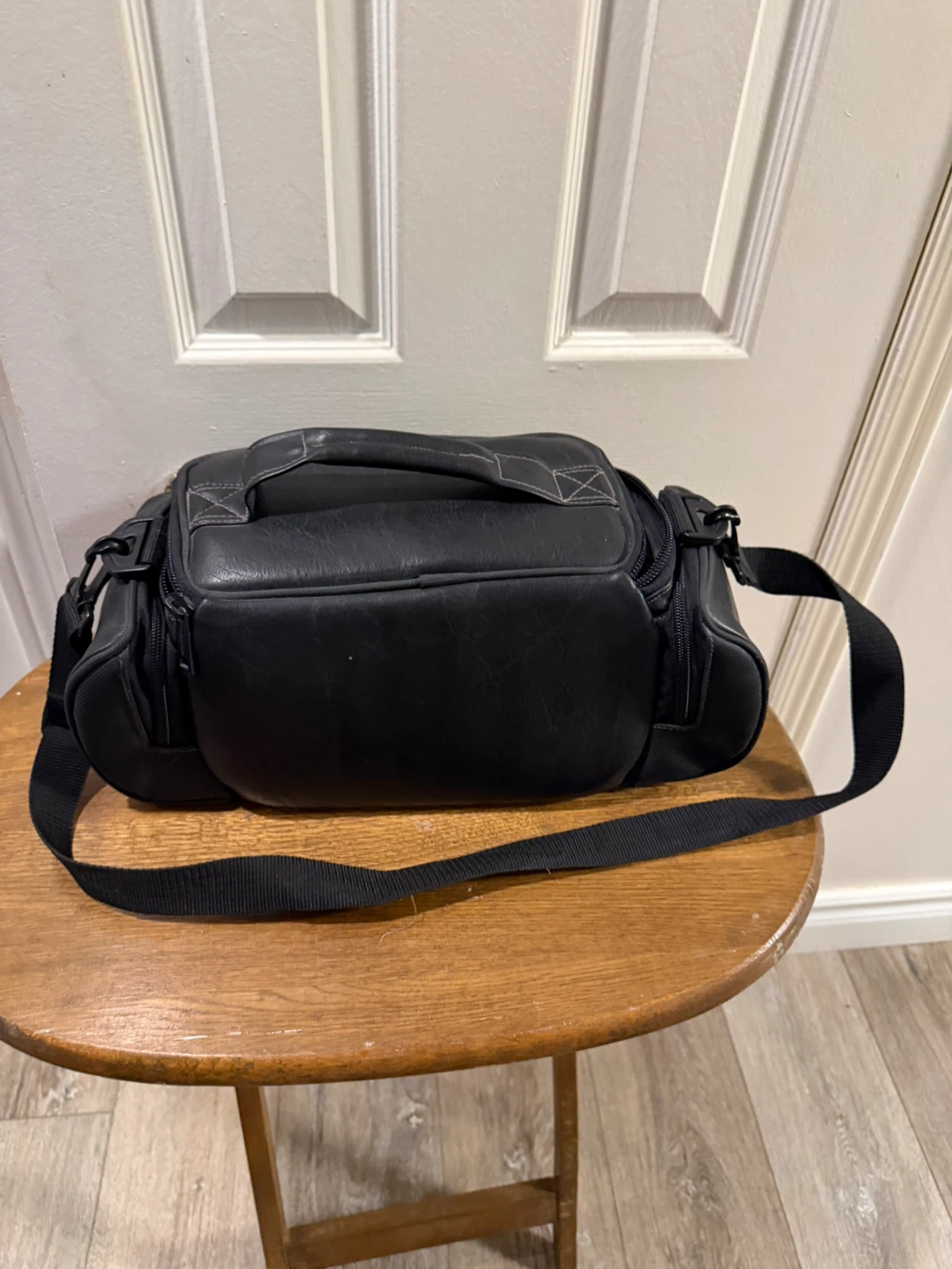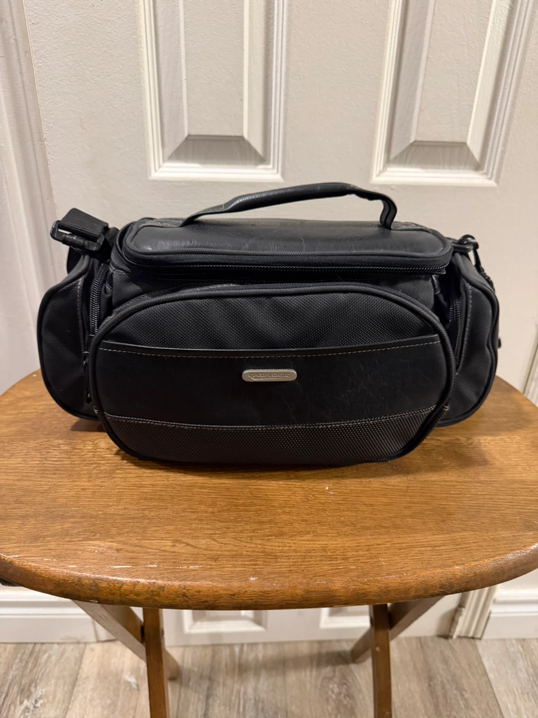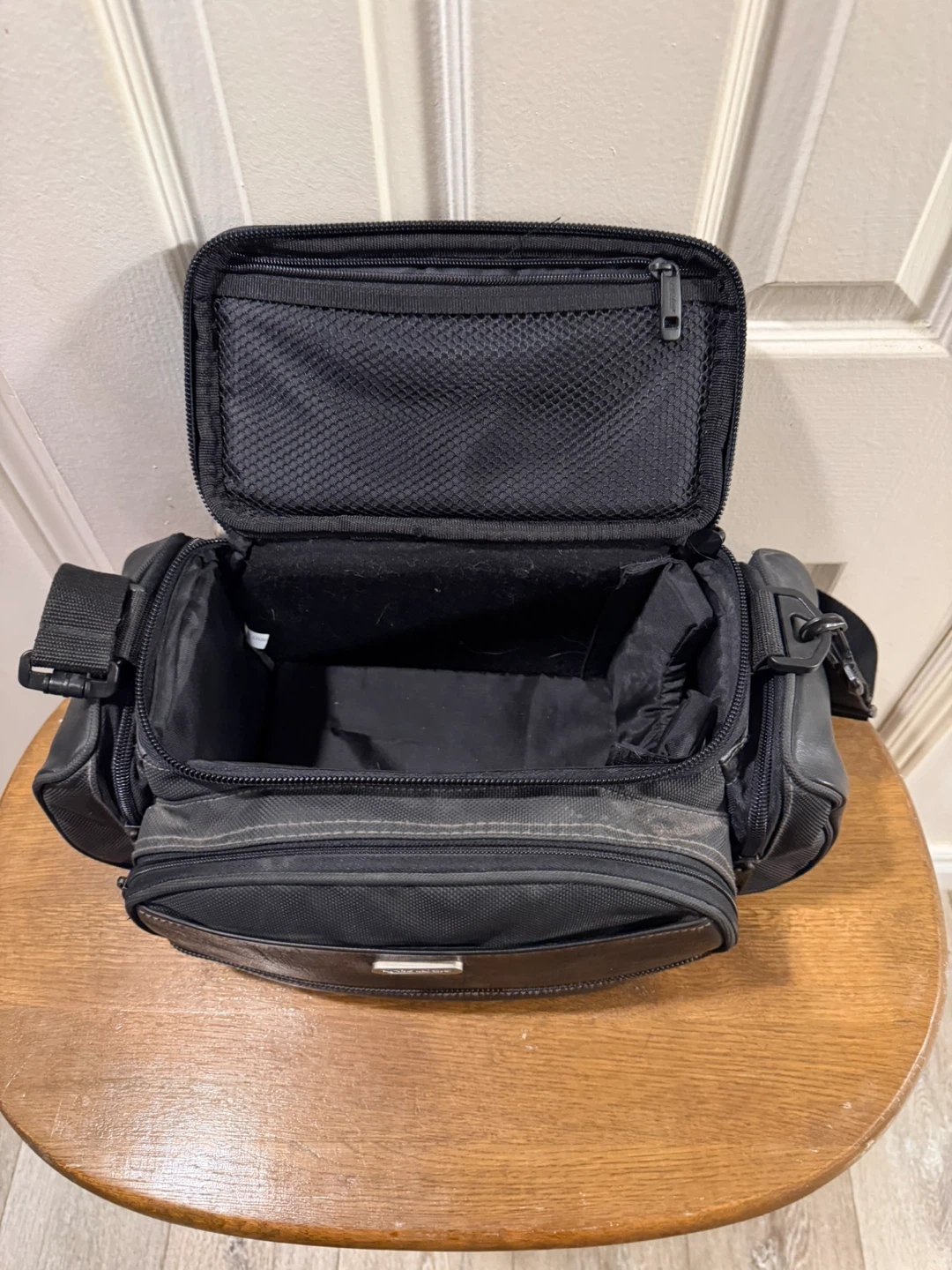 This black camera bag has a main compartment with a zippered mesh pocket inside the lid. It's made of synthetic leather and fabric. Includes a detachable shoulder strap.