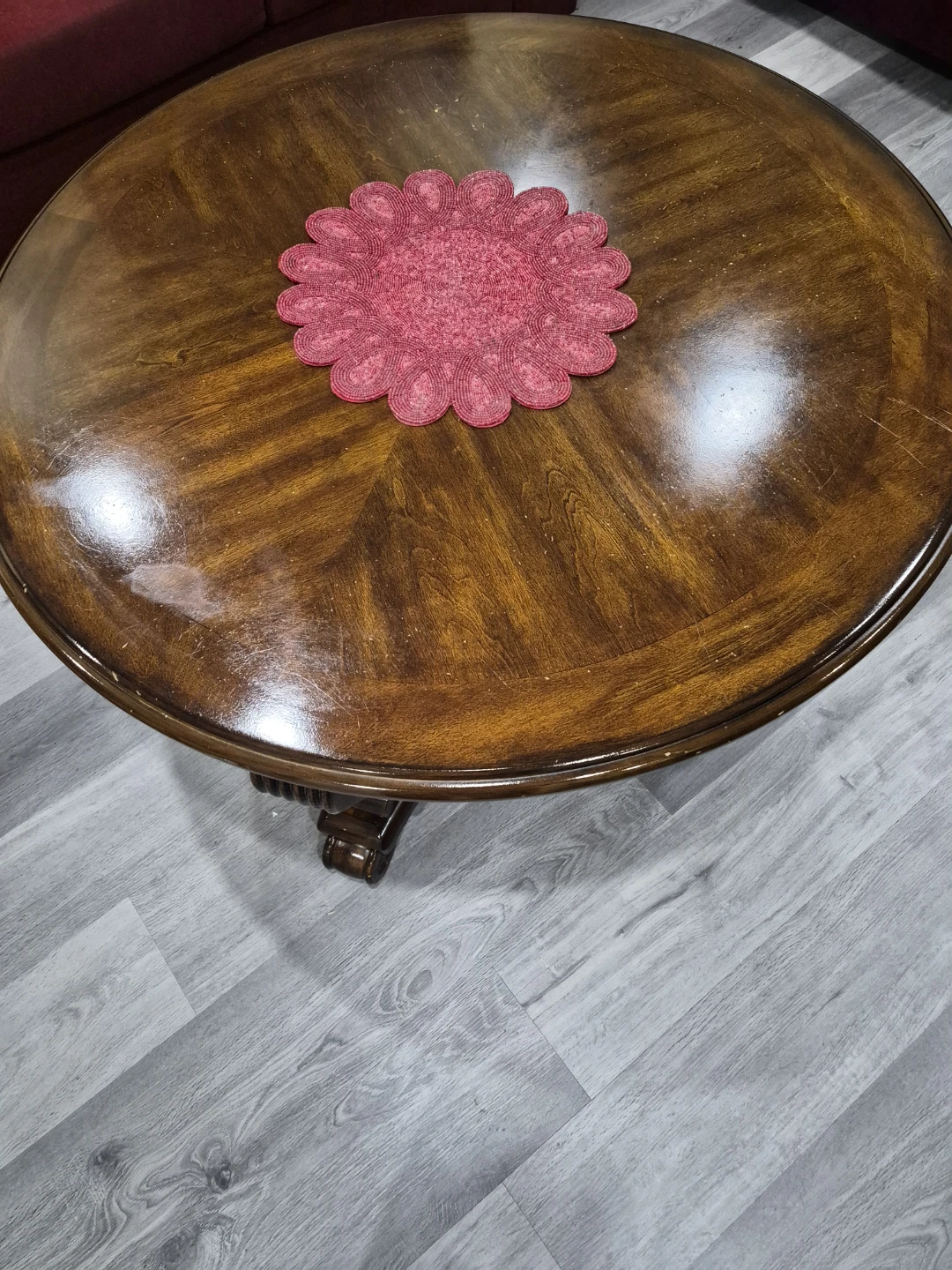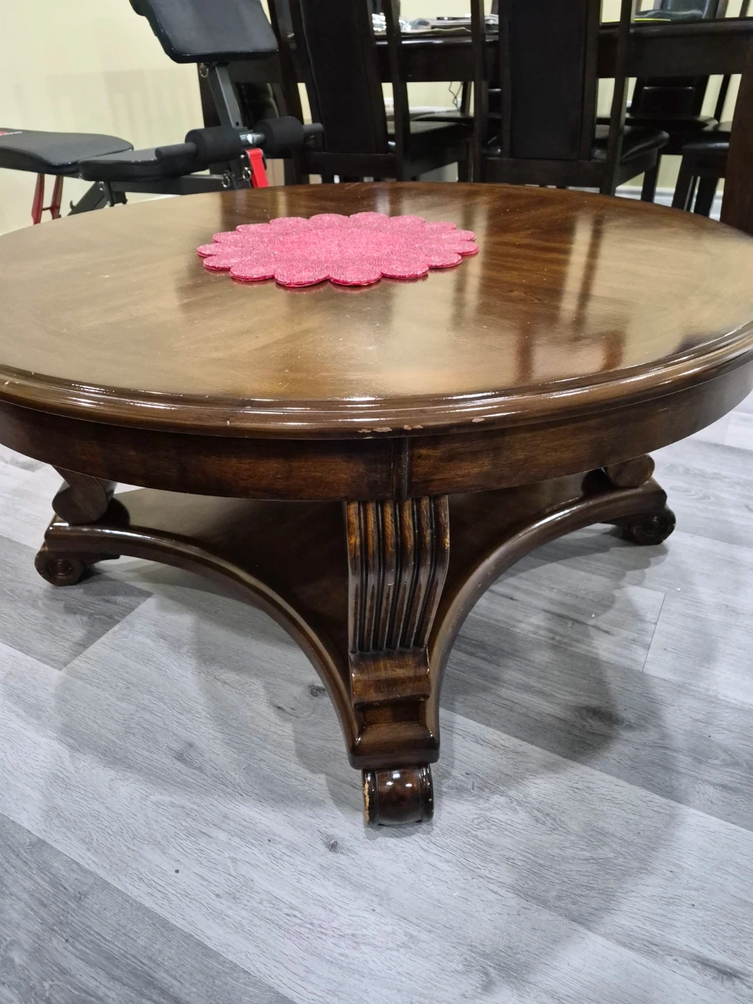 Ashley's dark wood round coffee table with a decorative base. The table shows some sign of use, with some minor scratches. It's a solid piece perfect for a living room setting. Location is close to cineplex in Milton.