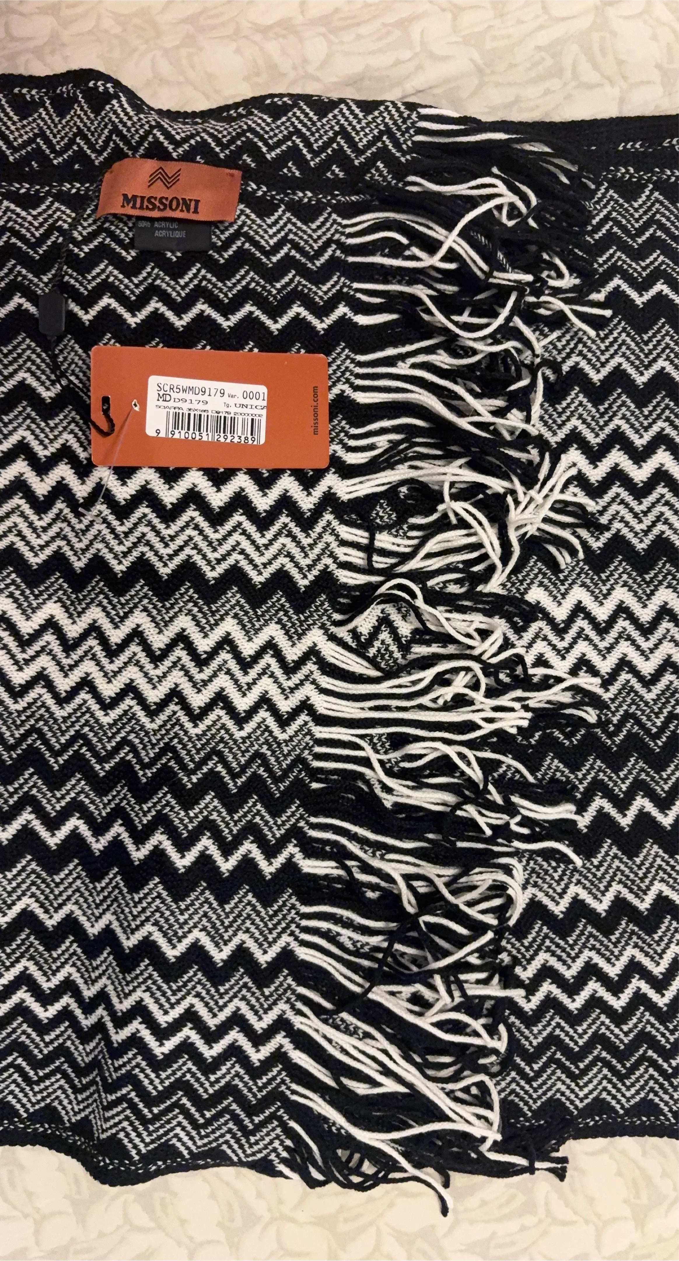 This is a Missoni knit scarf in black and white with the iconic zigzag pattern. It's made with 50% acrylic and features fringe detailing on the ends. The size is listed as UNICA, which is typically one size fits all.