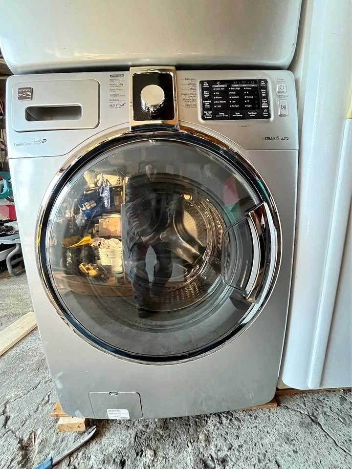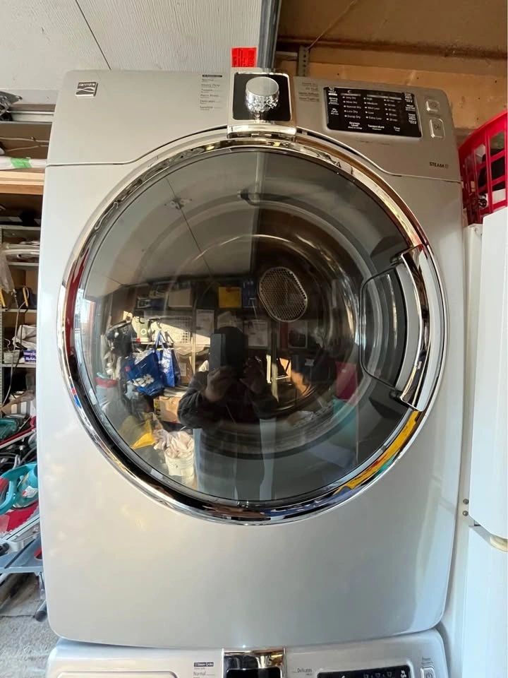 Great condition Kenmore front-loading washer and dryer set. The washer has various cycle options and a large capacity drum. The dryer has multiple heat settings and a steam function. Both appliances are electric and have a modern design. Feel free to message if you have any questions!