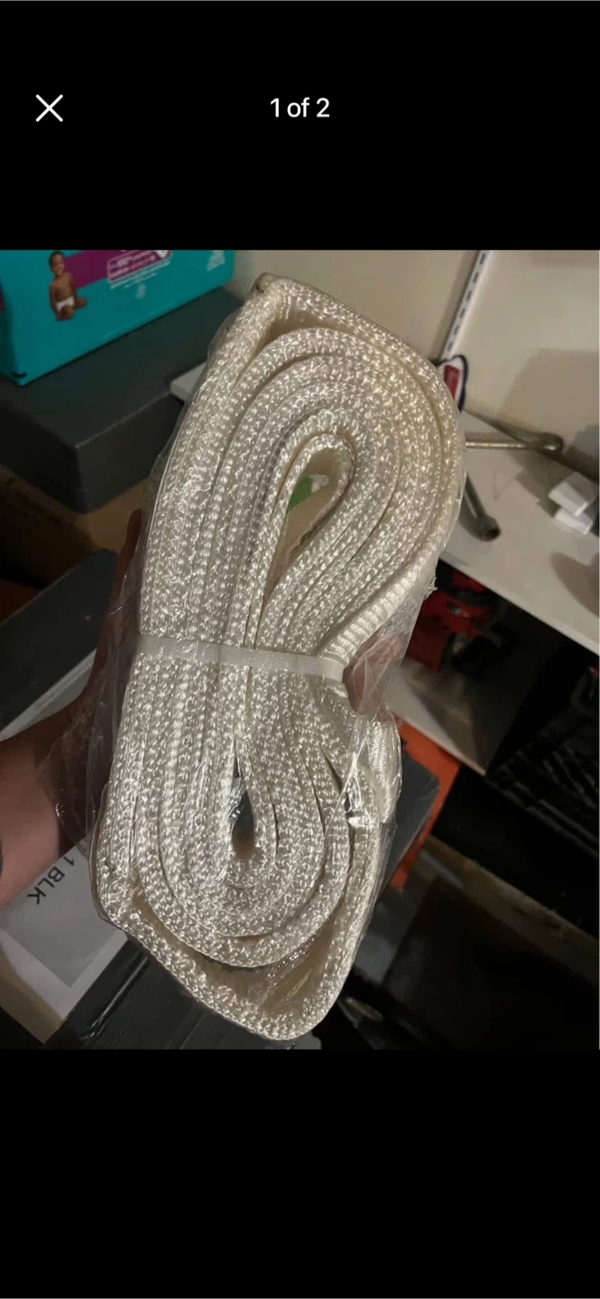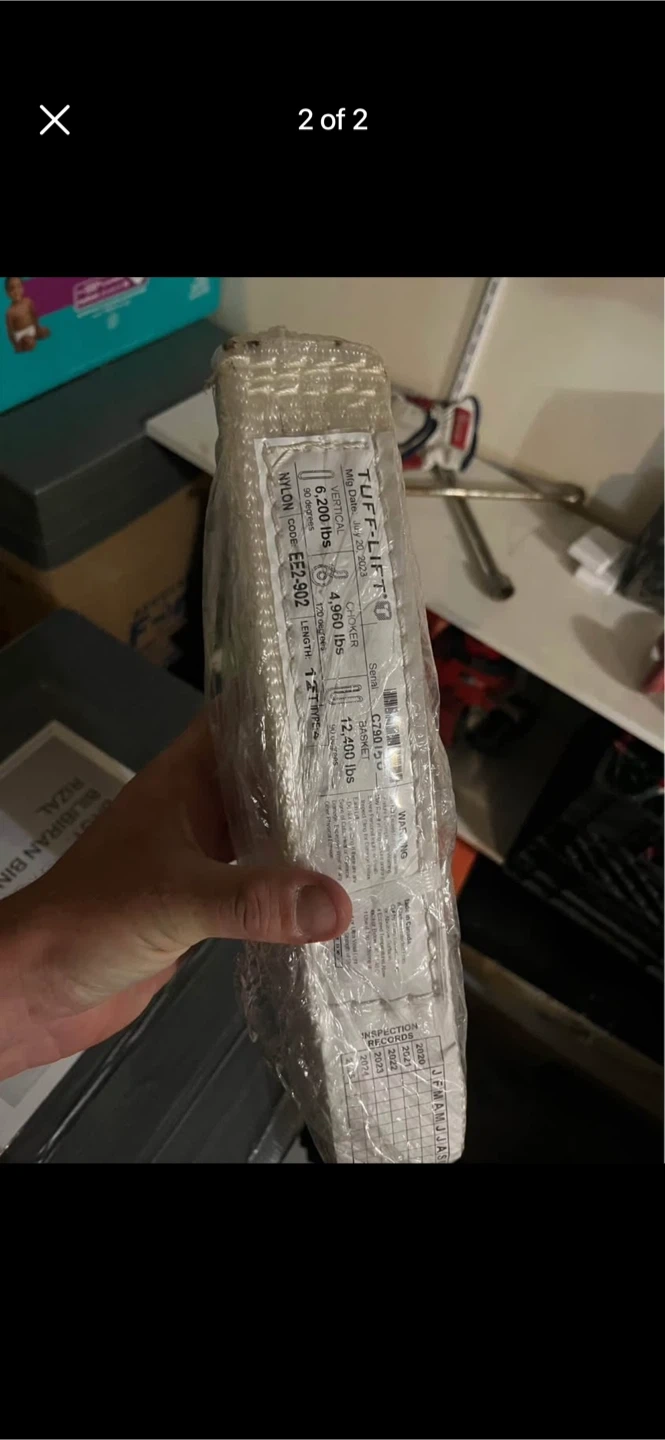 Selling a Tuf-Lift EE5602 sling. It has a vertical hitch capacity of 6,200 lbs and a choker capacity of 4,960 lbs. The basket capacity is 12,400 lbs. It's 2 inches wide and 7 feet long