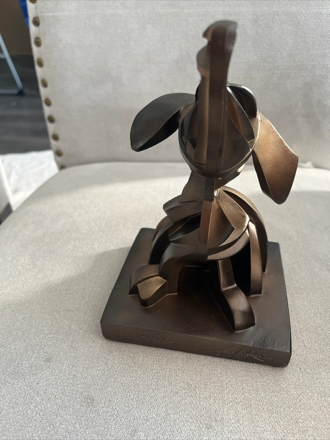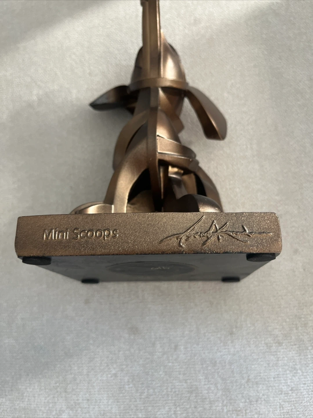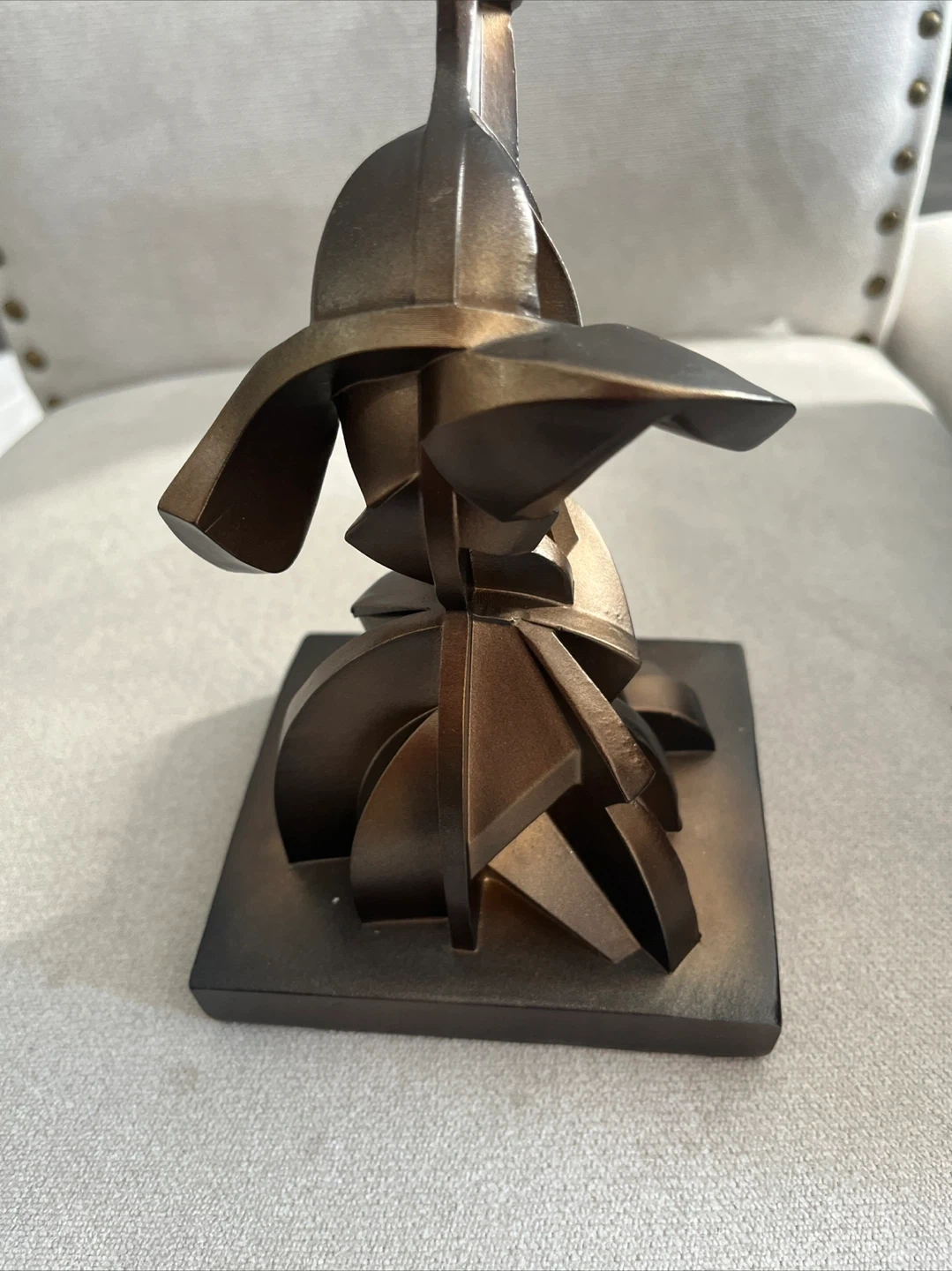 This is a bronze abstract sculpture figurine. It's designed in a modern, geometric style. The piece has a metallic bronze finish. It's a decorative item that would work well on a shelf or desk.
