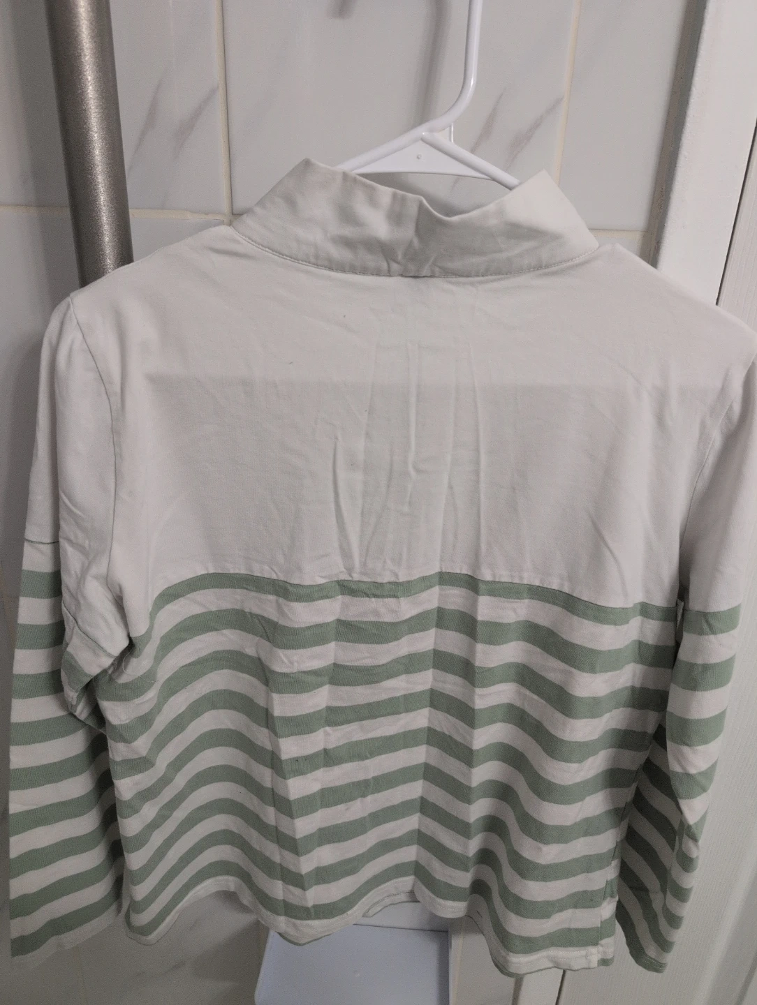 A white and mint green striped long sleeve top with a 1/4 zipper and mock neck. It's a size 2XL. This top offers a relaxed fit for everyday wear.