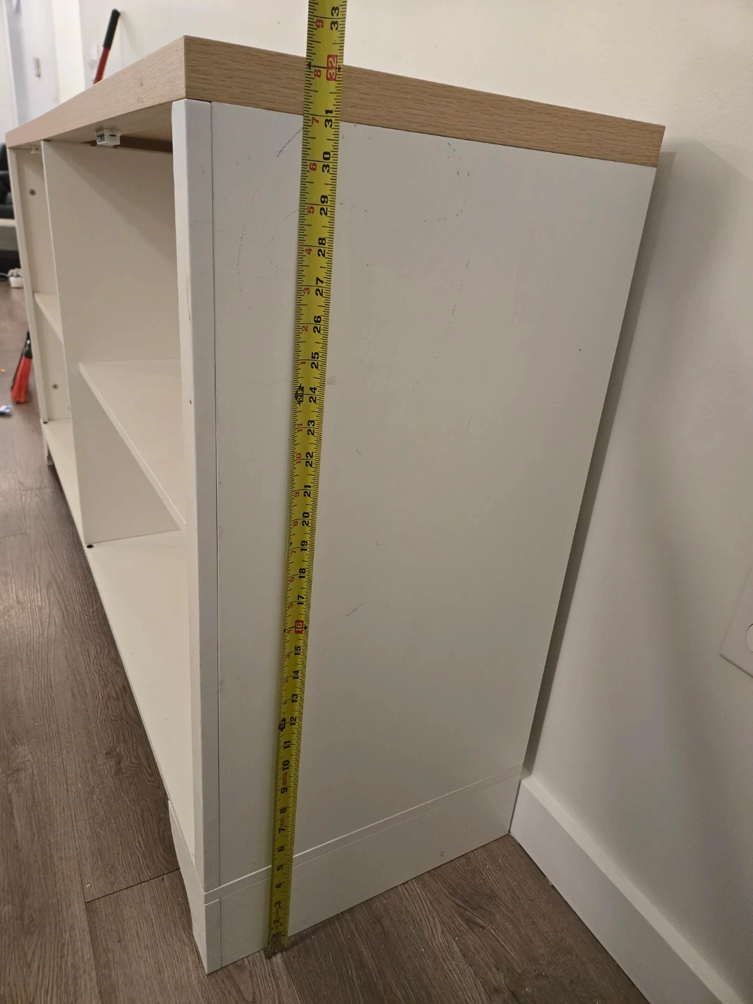 This cabinet features a white body with an oak-look top. It has two open shelves. Dimensions: 32" tall, 15 ³/4" deep, 61" long.
