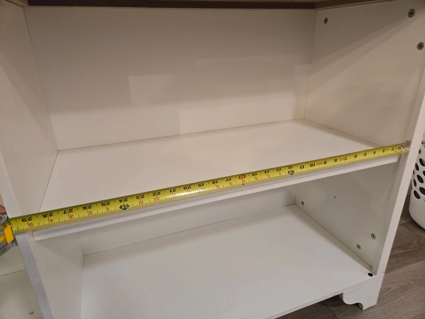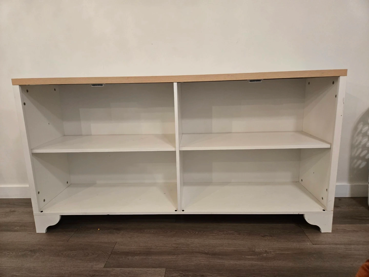 This cabinet features a white body with an oak-look top. It has two open shelves. Dimensions: 32" tall, 15 ³/4" deep, 61" long.