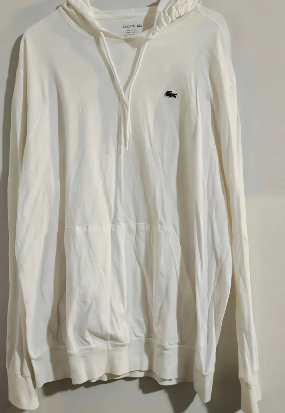 This is a white Lacoste hoodie made from 100% cotton. It's a regular fit and comes in a US 3XL size. This hoodie would be useful for casual wear or layering on cooler days.
