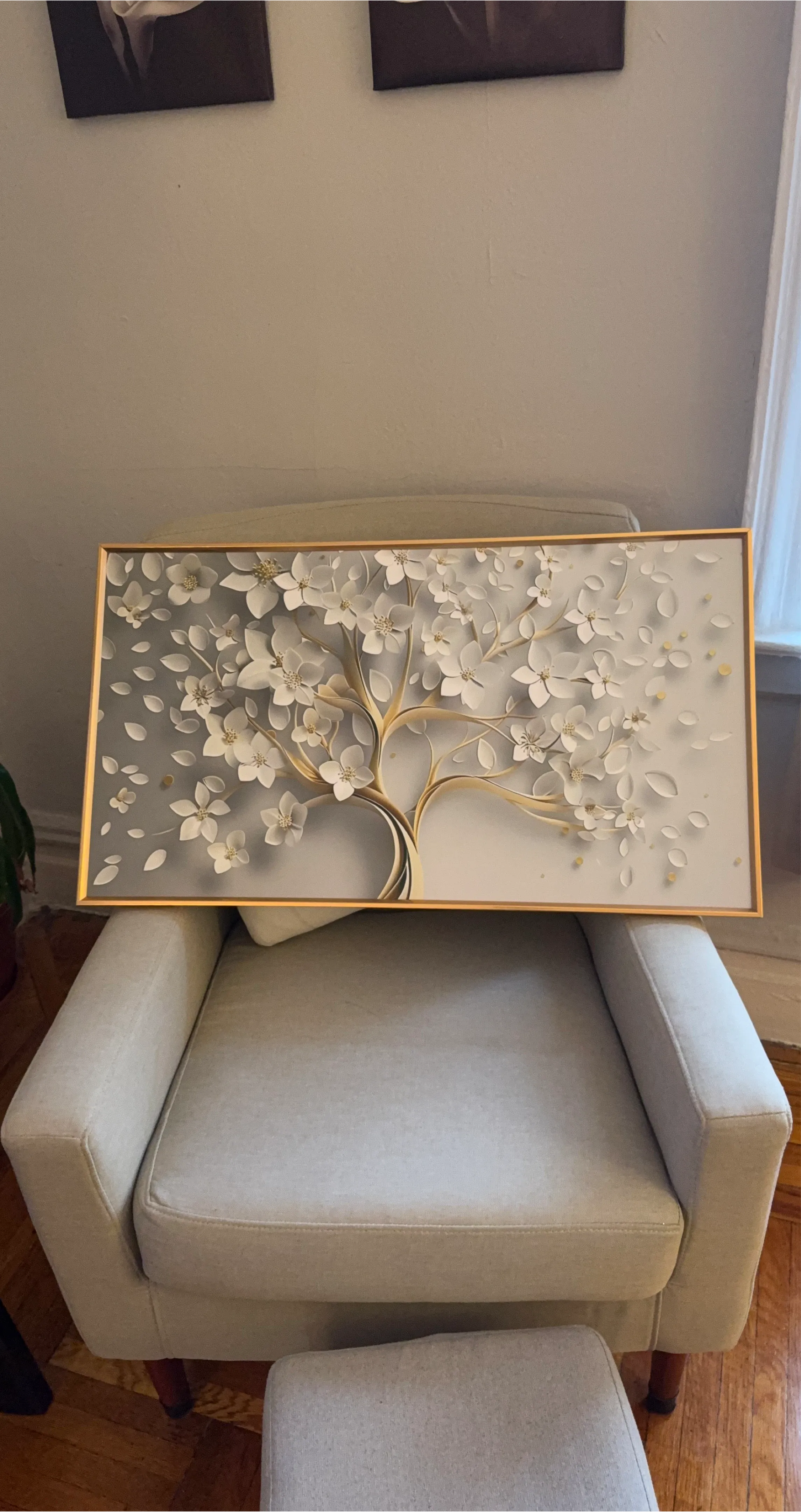 Add a touch of elegance to your home with this stunning 3D canvas wall art. It features a beautiful white cherry blossom tree design with intricate details and a shimmering gold frame. This piece will surely be a conversation starter!
