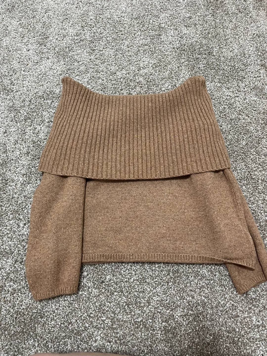 This cozy brown sweater has an off-the-shoulder design. It's made from a soft knit material. The ribbed neckline adds a nice touch. It's a stylish piece for cooler weather!