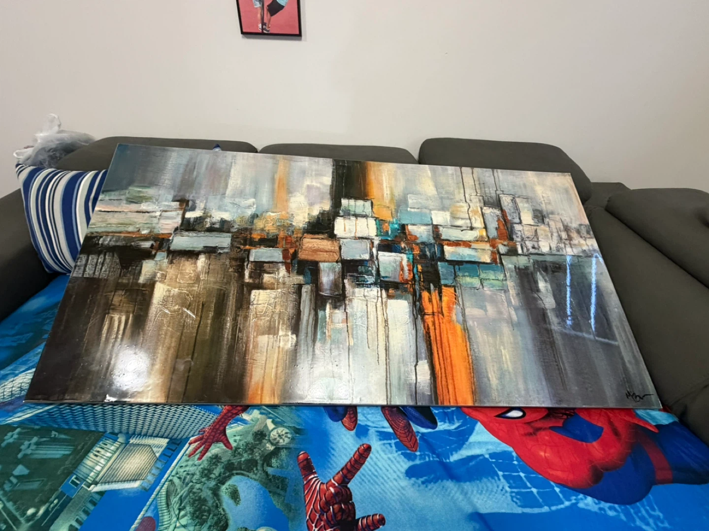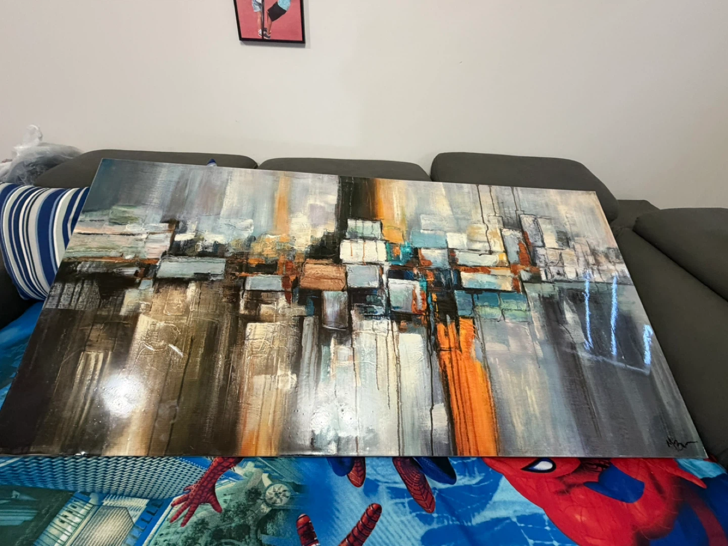 Canvas painting featuring an abstract.The piece showcases a blend of cool and warm tones with textured brushstrokes. It's a large statement piece that'll add a modern touch to any room.