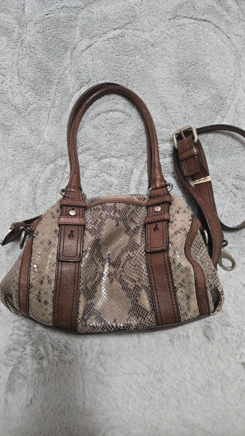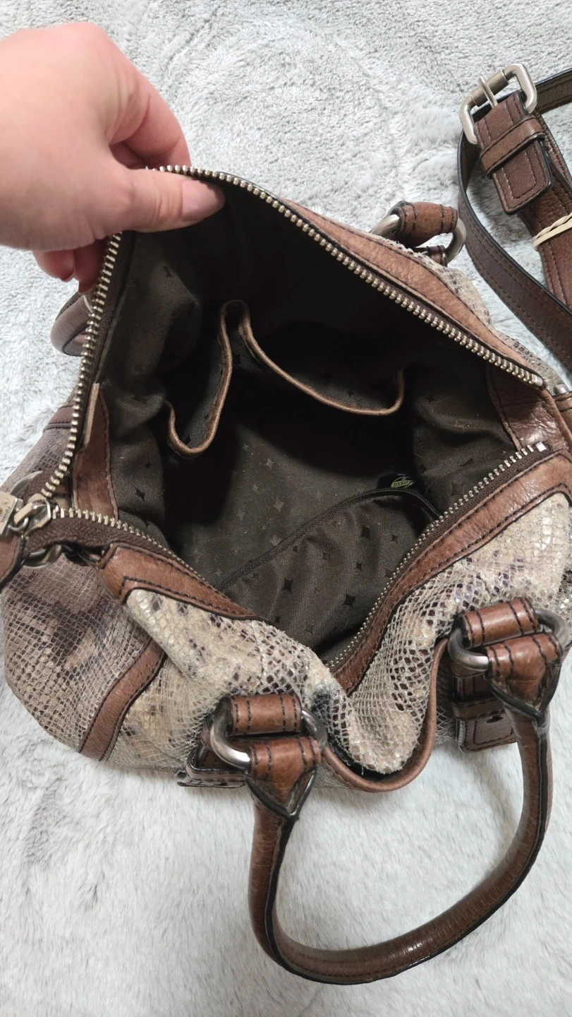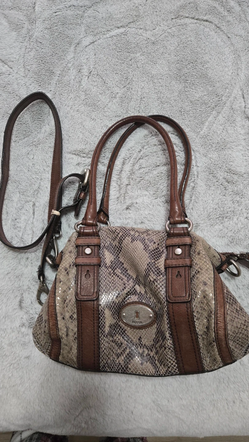 Selling this gorgeous faux snake skin Fossil bag. Can be made into a cross body as well. Genuine Fossil purse. Has good amount of pockets and is quite spacious too!
