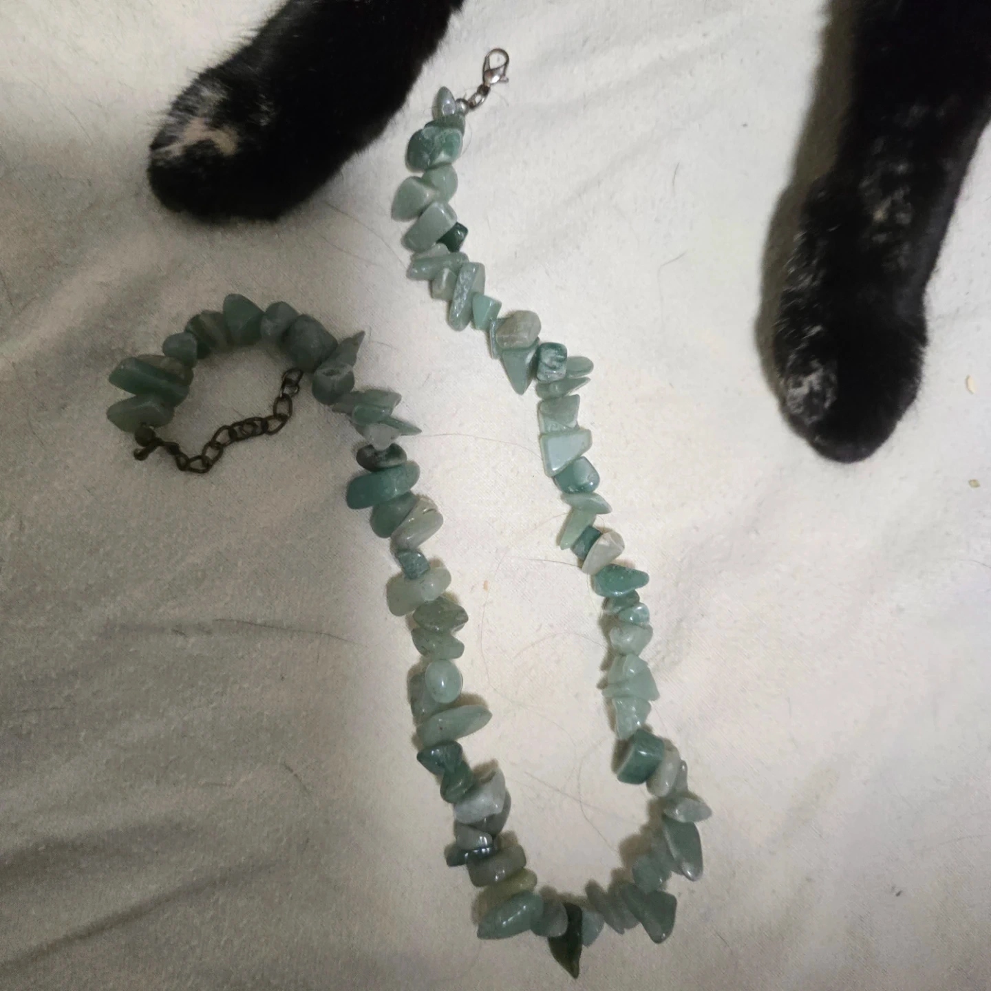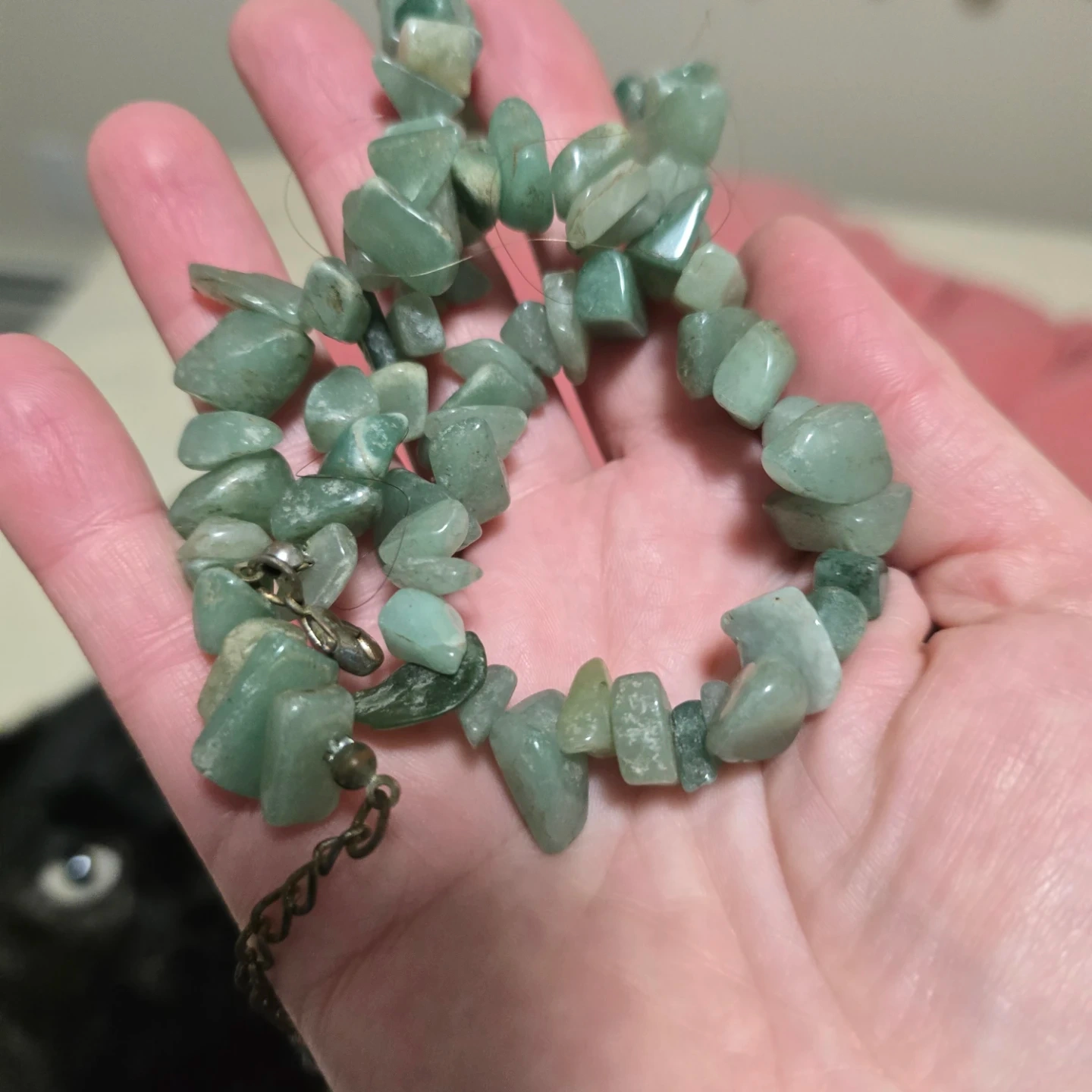 This necklace features irregular green stone chips strung together on a metal chain. It has a lobster clasp closure. A lovely piece for adding a pop of colour!