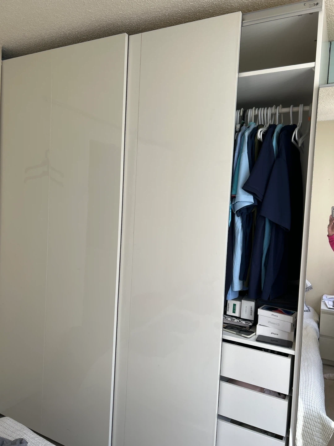 This is a large IKEA PAX wardrobe system featuring smooth sliding doors. It includes ample hanging space, shelves, and drawers for all your storage needs. It's a great solution for organizing clothes and accessories in your bedroom.