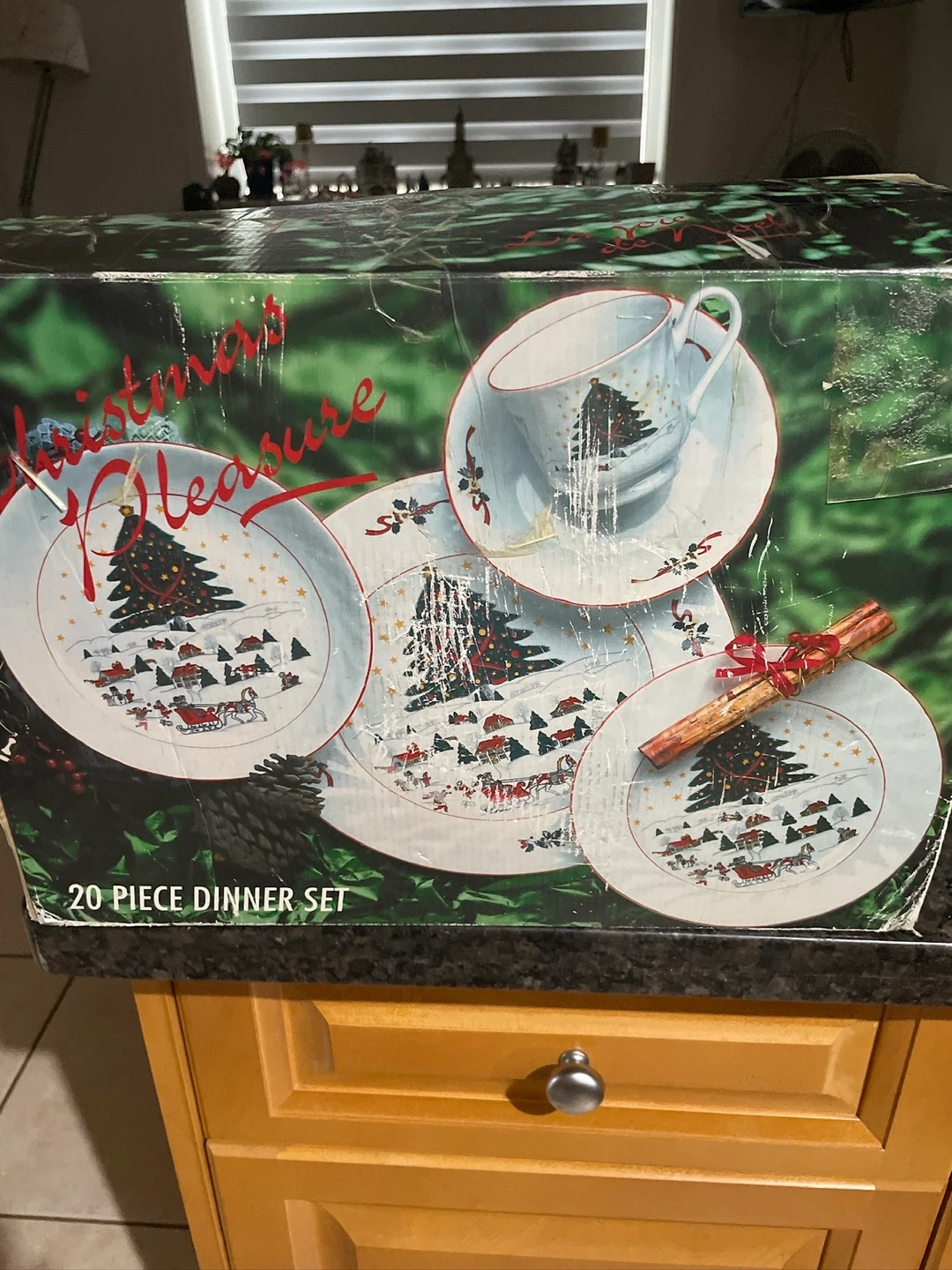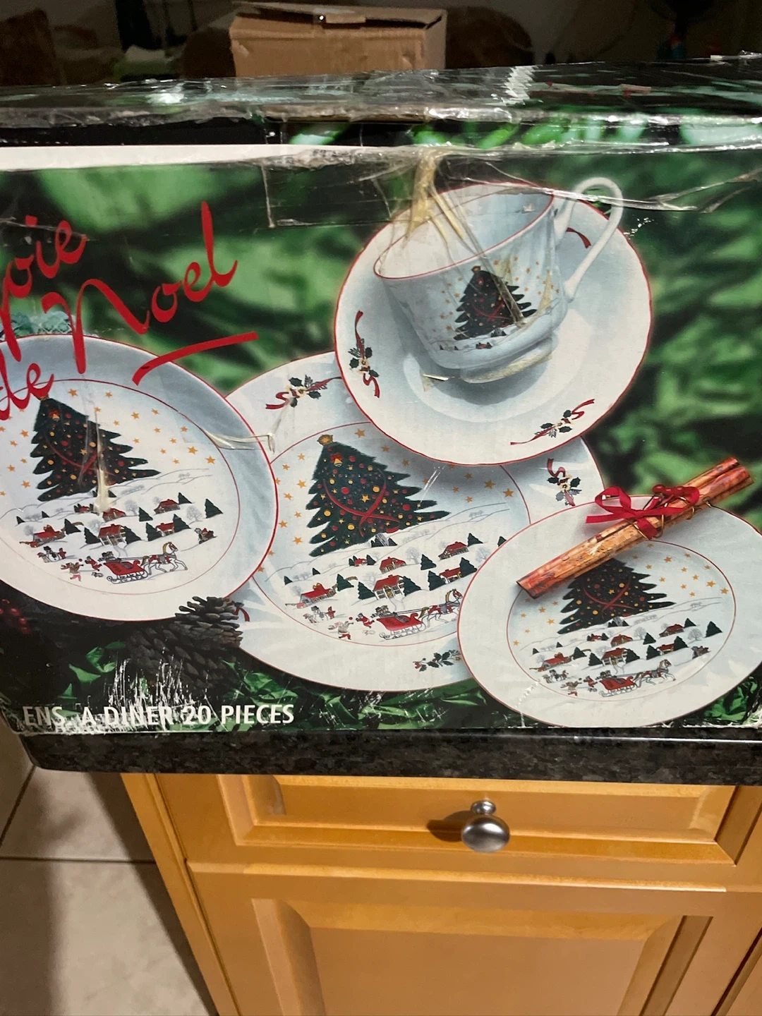 Selling a Joie de Noel Christmas Pleasure 20 piece dinner set. The box shows a festive Christmas tree and winter village design on the plates and cups! Perfect for adding a touch of holiday cheer to your dining table during the Christmas season
