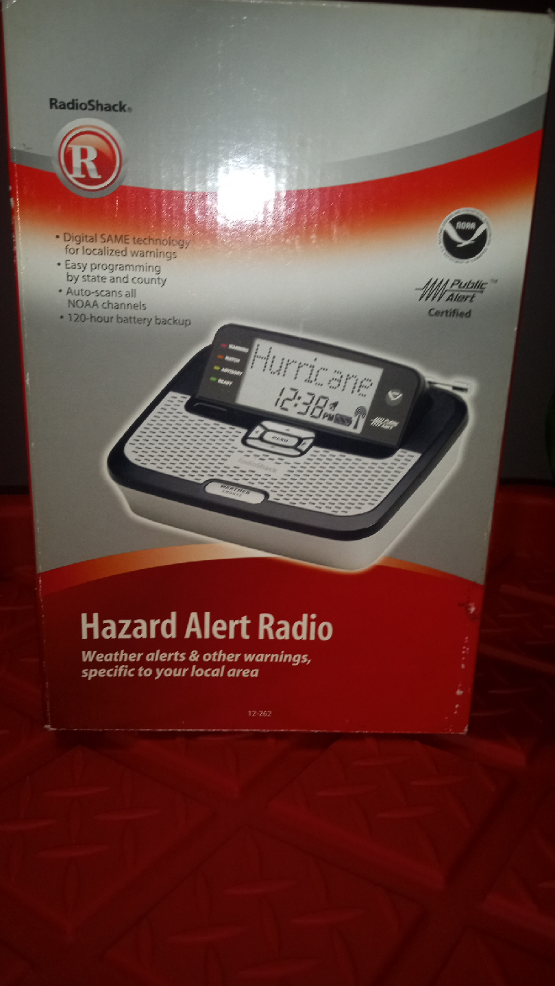 Selling a RadioShack Hazard Alert Radio, perfect for keeping you informed about weather alerts and other warnings specific to your local area! It features Digital SAME technology for localized warnings, easy programming by state and county, and auto-scans all 7 NOAA channels. It also has a 120-hour battery backup. Box included!