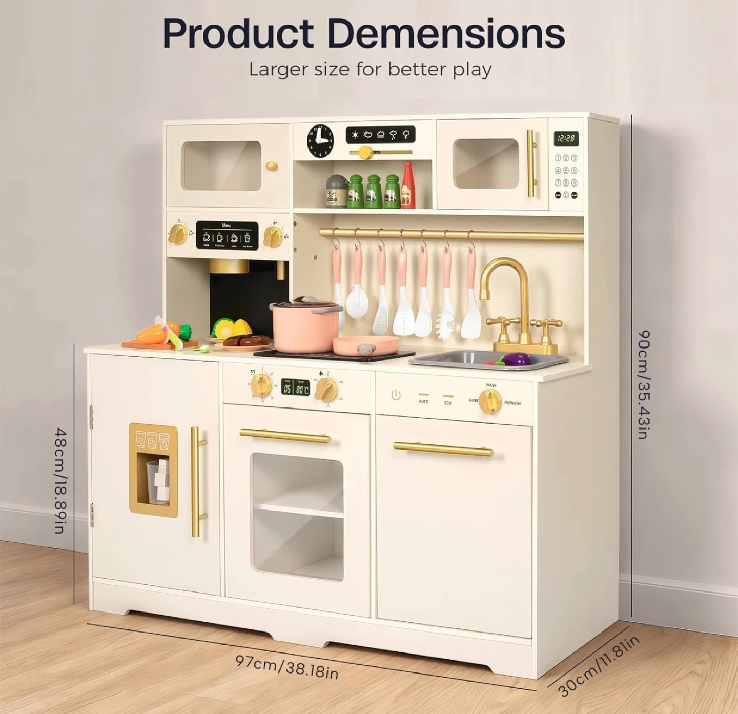This all-in-one wooden play kitchen set is equipped with popular kitchen accessories for hours of fun. It includes pots, pans, utensils, and play food. Dimensions: 97cm x 48cm x 90cm.