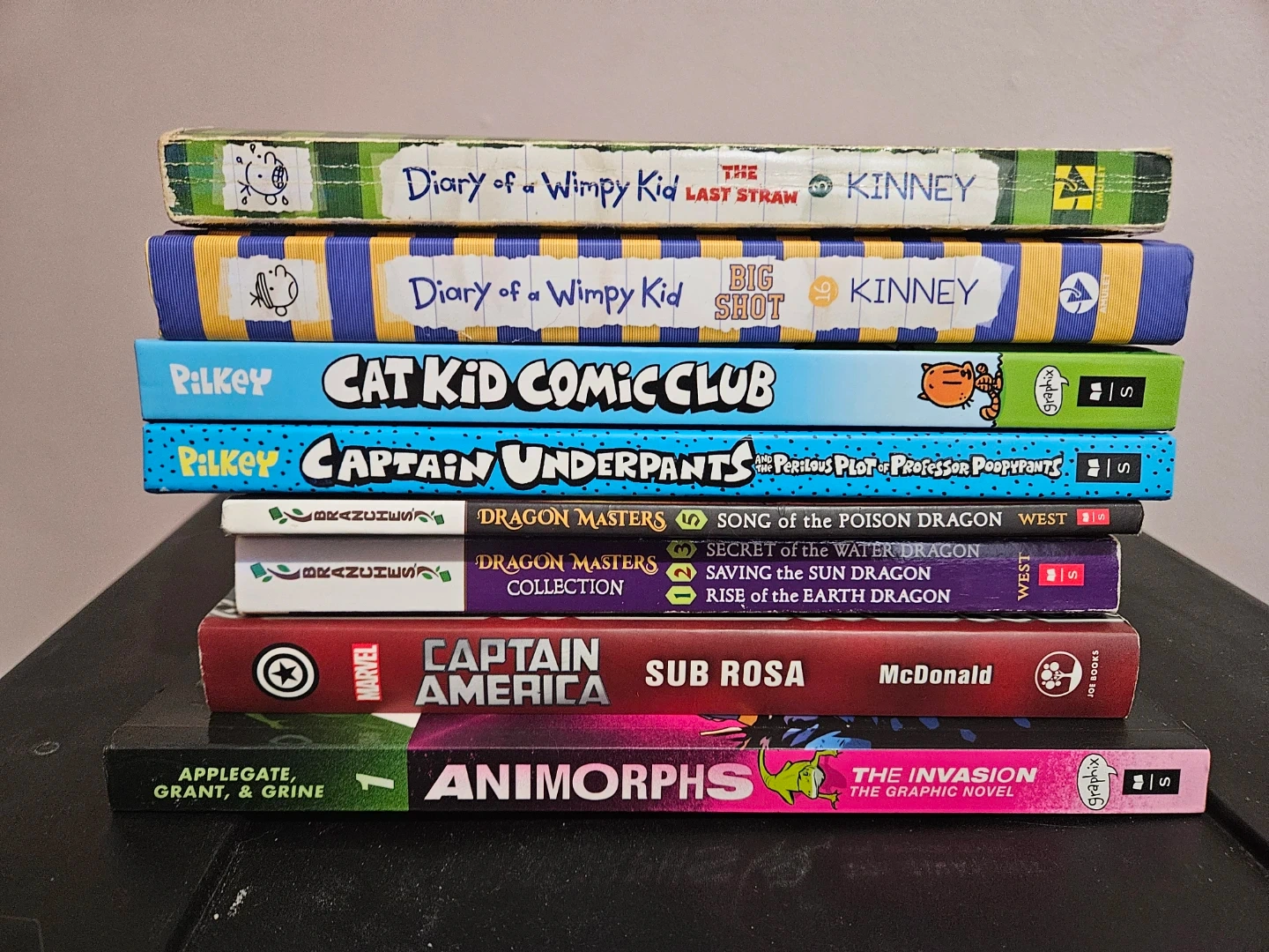 This is a collection of popular children's books. It includes titles from the Diary of a Wimpy Kid, Cat Kid Comic Club, Captain Underpants, Dragon Masters, Captain America, and Animorphs series. These books are great for young readers looking for engaging stories and comics. They're perfect for home or school reading.