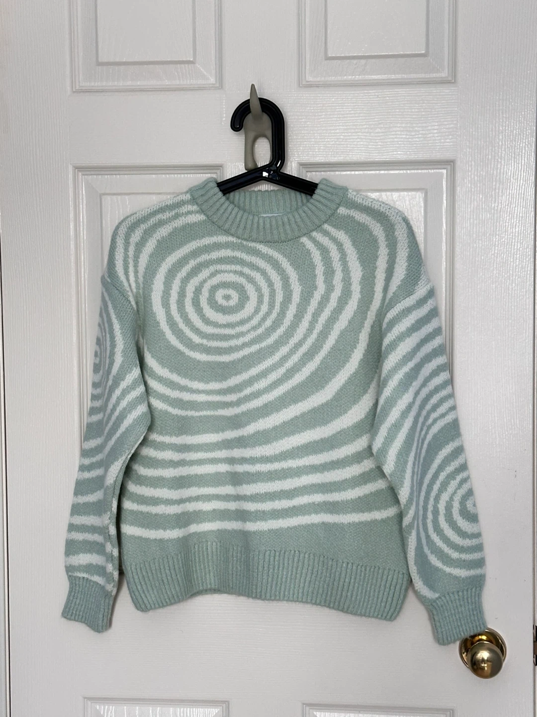 A cozy knit sweater with a cool mint green and white swirl pattern. It's a crew neck style with ribbed cuffs and hem. This sweater is made from a soft, comfortable knit fabric.