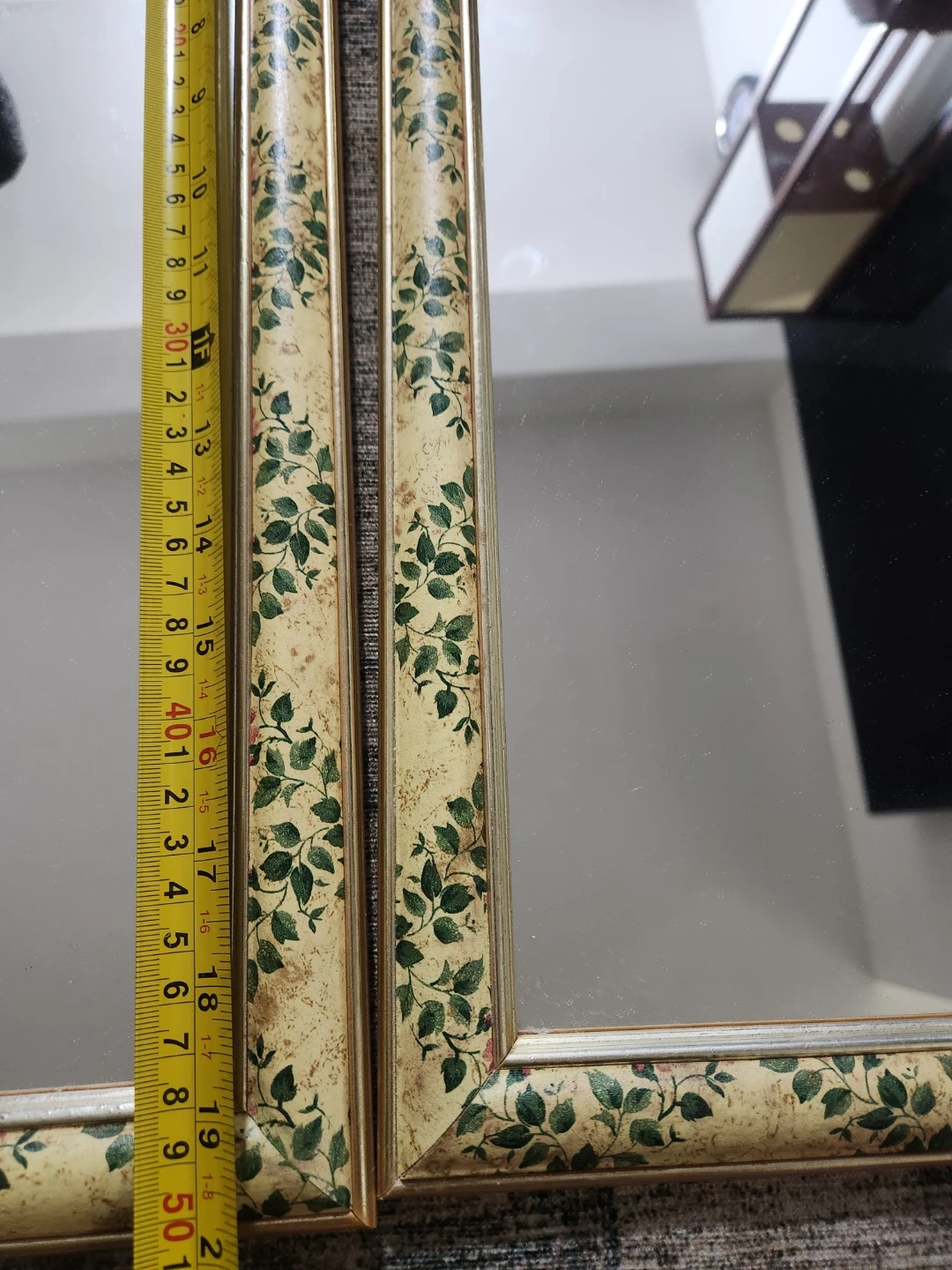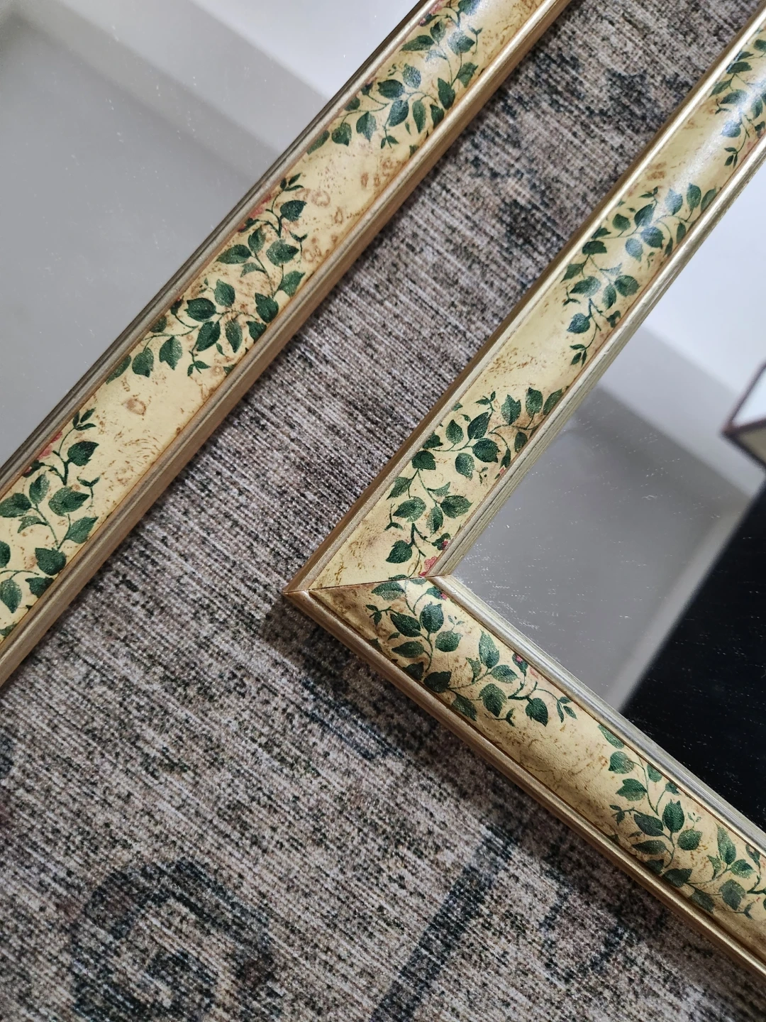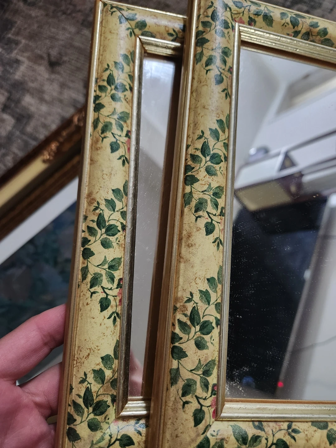 This set includes two decorative wall mirrors with a vintage floral pattern on the frame. They're great for adding a touch of charm to any room. The larger mirror measures approximately 11.5" x 19.5" and the smaller mirror measures approximately 8" x 15.5".