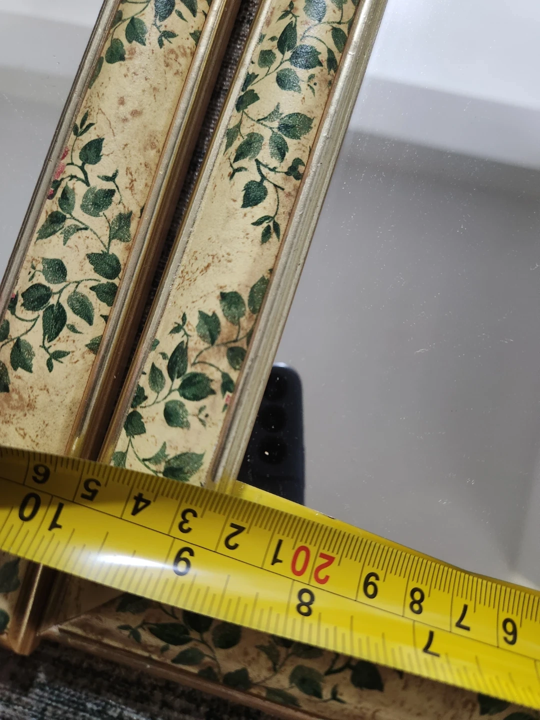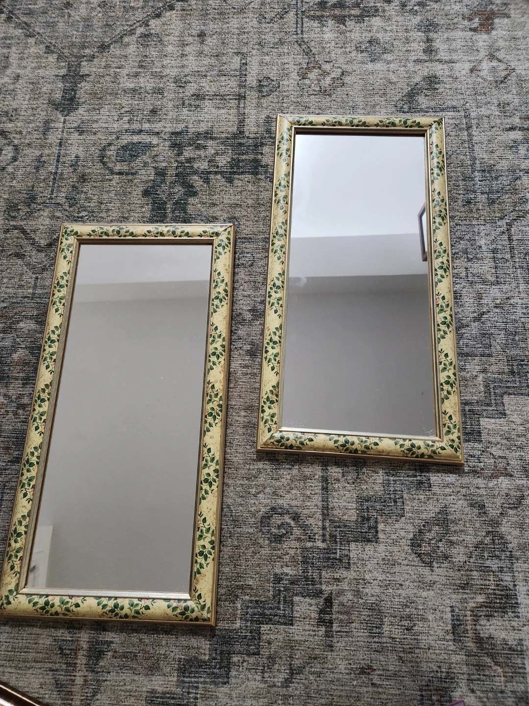 This set includes two decorative wall mirrors with a vintage floral pattern on the frame. They're great for adding a touch of charm to any room. The larger mirror measures approximately 11.5" x 19.5" and the smaller mirror measures approximately 8" x 15.5".